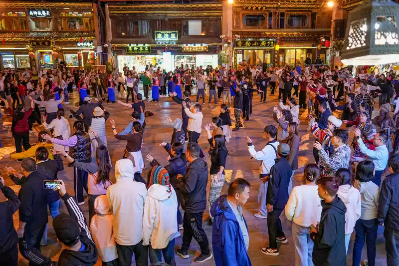 Dukezong Ancient Town is even more lively at night than during the day. Visitors can always find their favorite way of traveling, whether it is window shopping, mountain hiking, shopping, or dancing in the square to enjoy the carnival atmosphere.