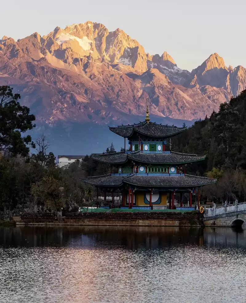 Departed at 7am to take a taxi/walk to Black Dragon Pond to see the sunrise over Golden Mountain. Walked around Lijiang Old Town, which was deserted that morning. Bought some flower cakes to take back (shops in the Old Town open between 9am and 10pm). Stopped by a coffee shop in the Honggu Slope Art District. Had lunch at a nearby stir-fry restaurant. Return