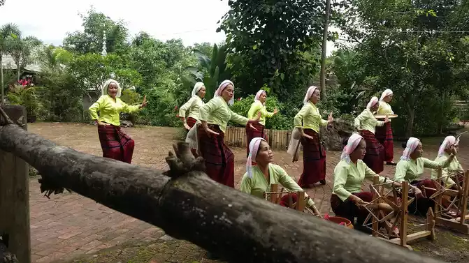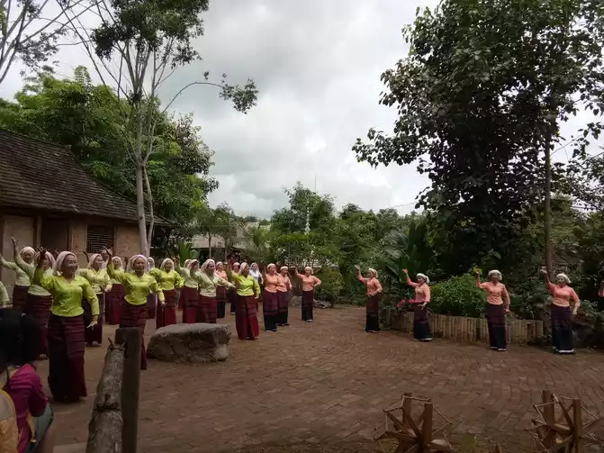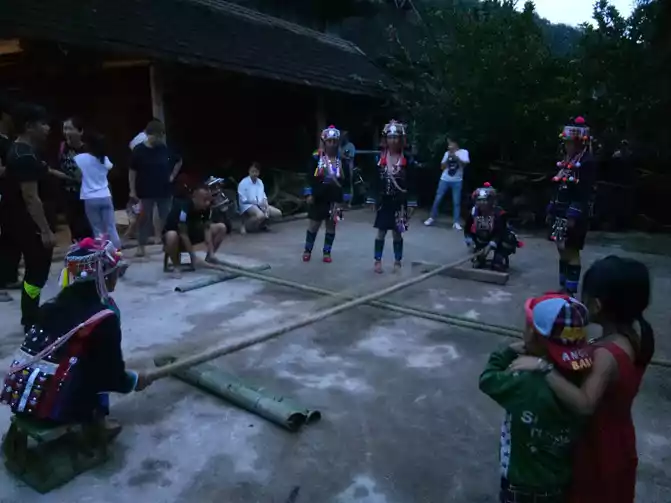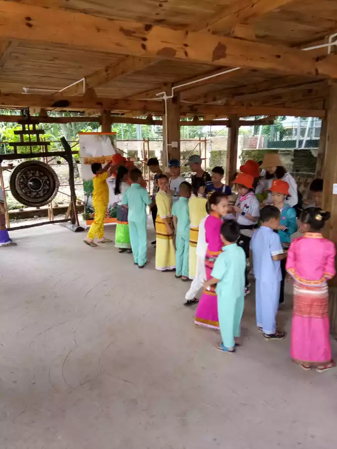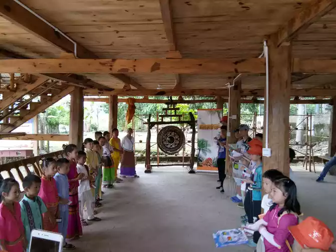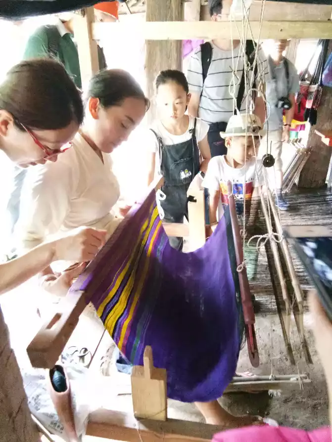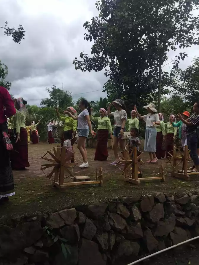 The village offers many activities, including dancing, water splashing, pottery making, papermaking, brocade weaving, and bamboo rafting.
