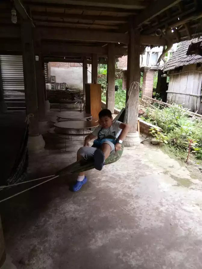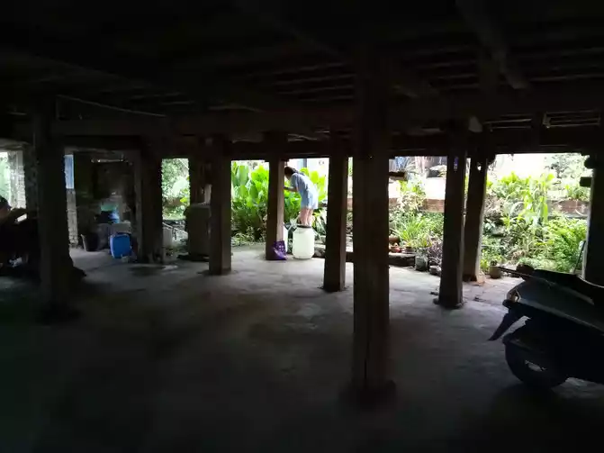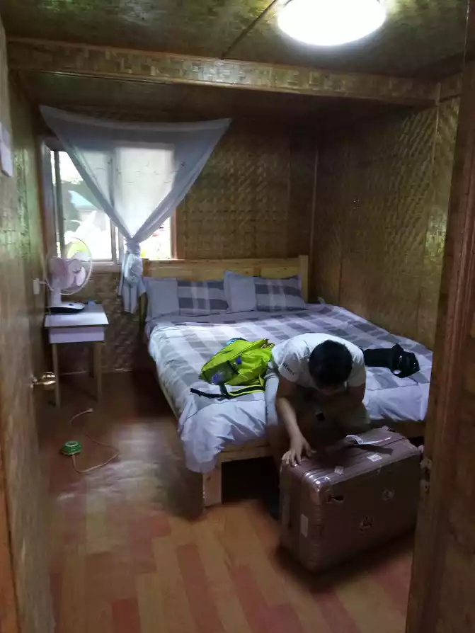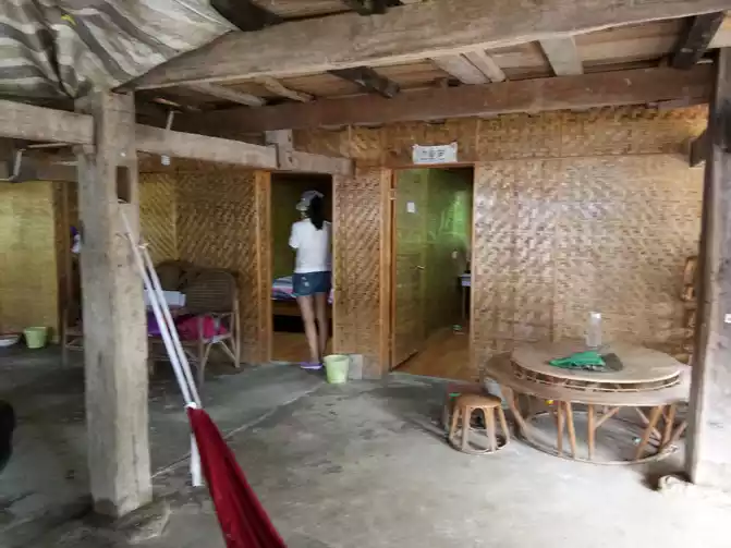 We live in Xiaoyu's stilt house. Downstairs are three guest rooms, each with a bed and an electric fan.