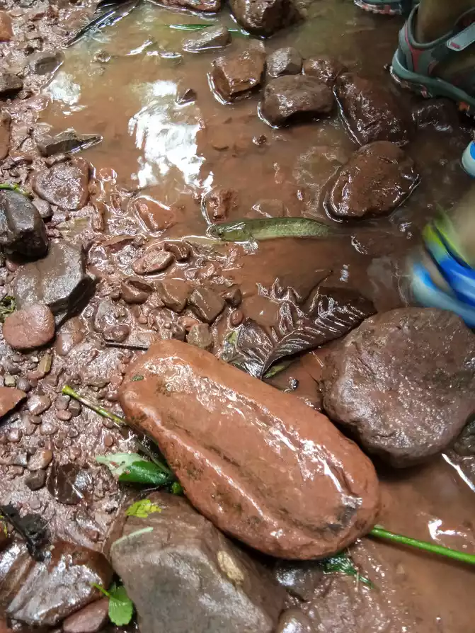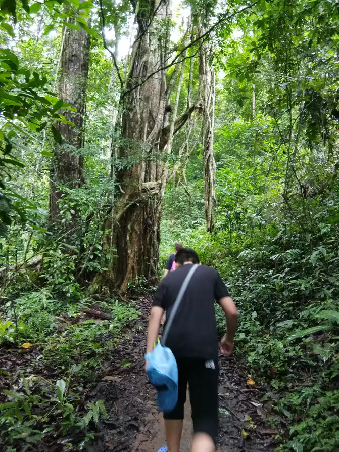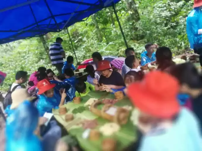 A rainstorm struck along the way, living up to the rainforest's reputation. I enjoyed a rainforest feast, enjoying a meal under an umbrella for the first time in my life.