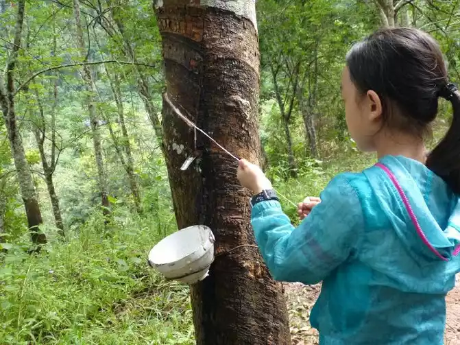 This is my first time seeing a rubber tree. There is a bowl tied to the trunk to collect the rubber juice.