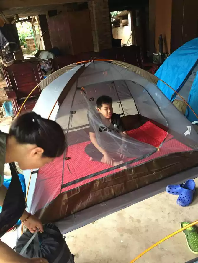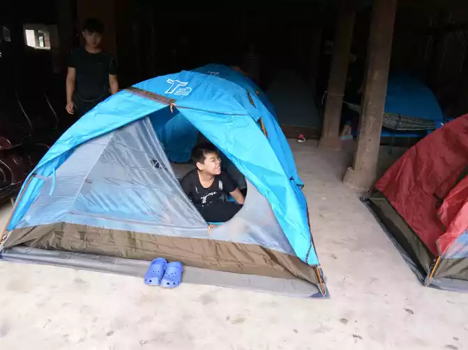 Upstairs is a single room with no bed, but some farm tools. The old man has built a fire and is making fishing gear. We sleep on the floor. Check in at Xiaoyu's house