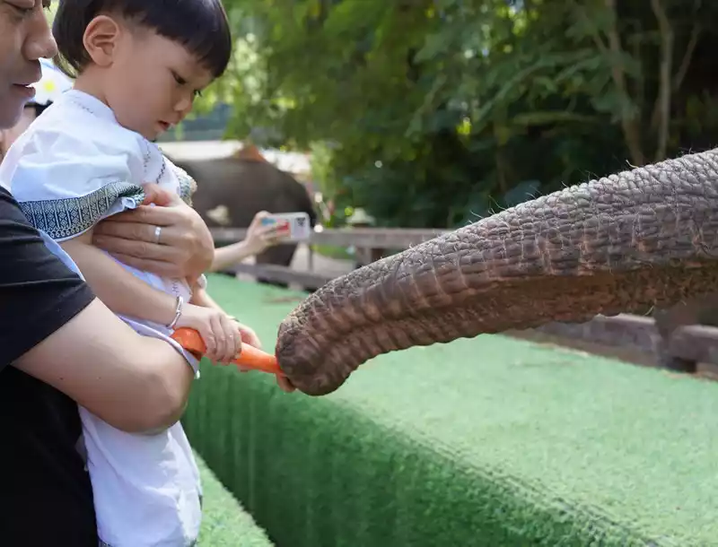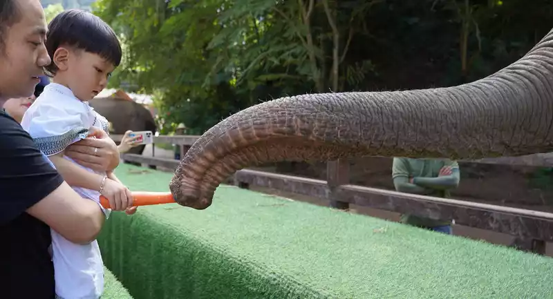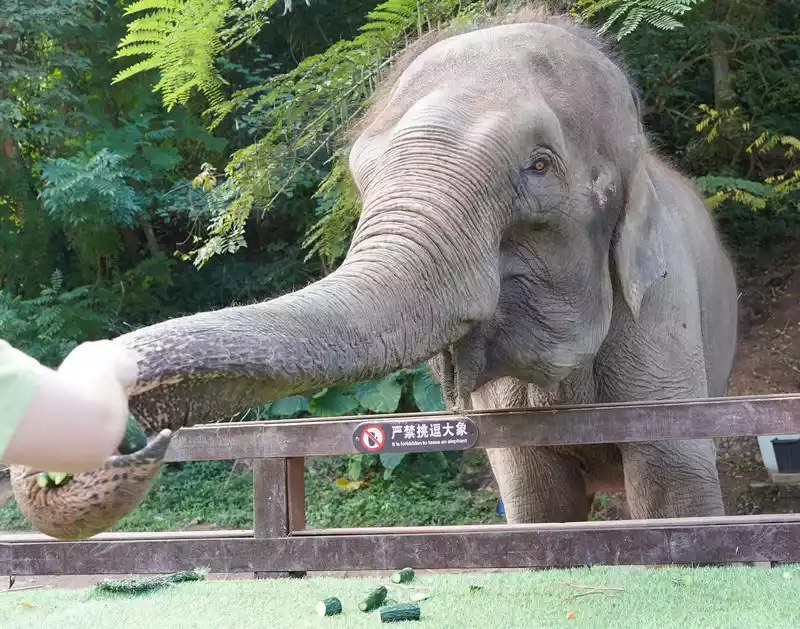 There's a fruit basket at the entrance. A small basket (a few carrots and cucumbers) costs ¥30, and a large basket costs ¥80. Once you buy a basket of fruit, you can enter the park to feed the elephants and even touch their trunks up close.