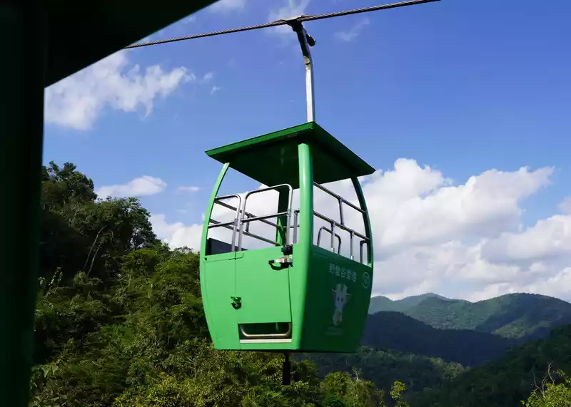 The cable car glides above the dense tropical jungle, with a sea of green beneath your feet.