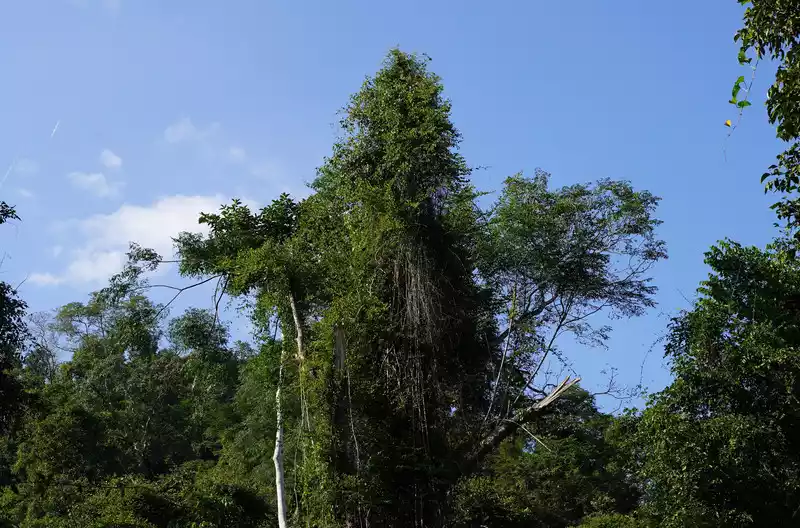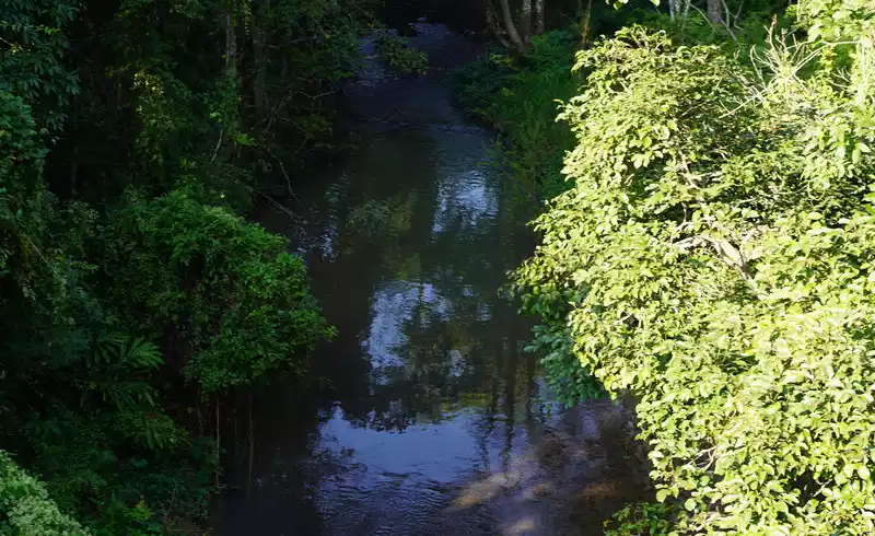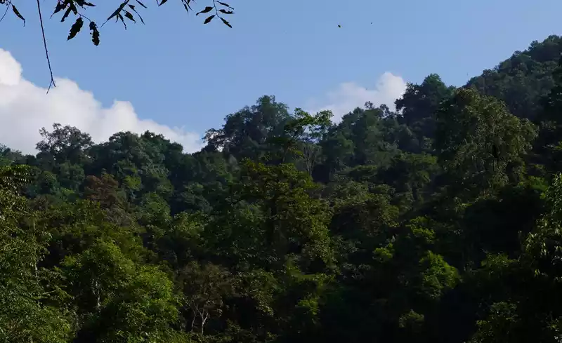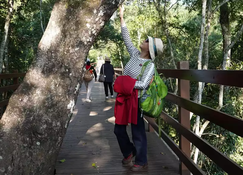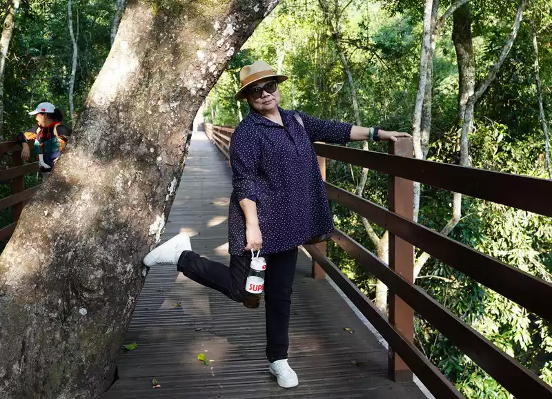 We stopped to observe but did not see any wild elephants. The 1,360-meter-long plank road stretches from the observatory to the north gate. A winding river flows beneath the path. Rare tropical plants can be seen along the trail, as well as traces of wild elephants, such as footprints and feces.