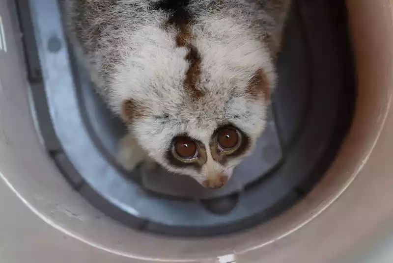 A security guard guided the slow loris into the cage; we saw another slow loris in the cage with its eyes staring upwards.
