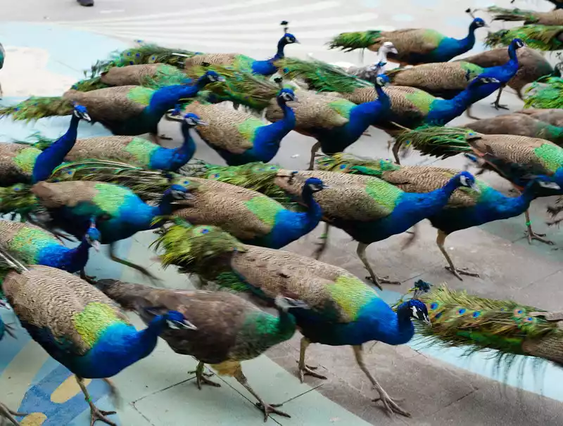 After the performance, the keepers guided the flock of peacocks back to their home.