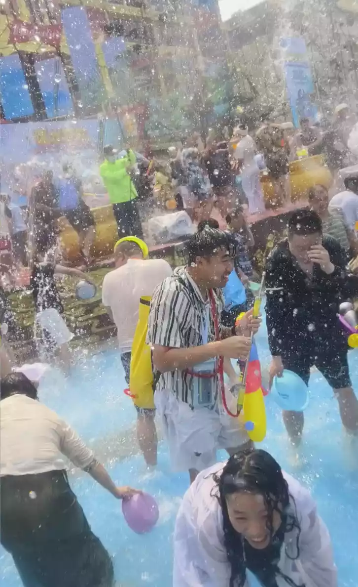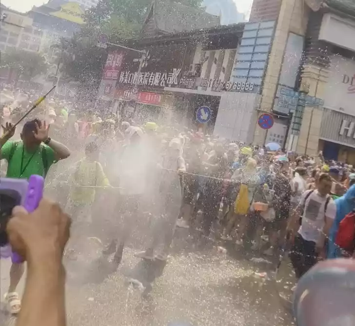 When we arrived at the first square in Gangnam, it was already packed with people. A ceremony was still taking place in the center, and the several pools in the square were filled with water. Only today was the water completely free. After the ceremony, at the command, people poured in from all directions. I later heard that there were probably over 60,000 people in the square, and everyone's weapons had switched from water guns to basins. This was truly the most exciting day I've had in years. My wife and I, even in our raincoats, were soaked to the skin. We quickly dispersed, and no one knew each other. A basin of water might have suddenly appeared out of nowhere, drenched from head to toe. The girls, despite being novice swimmers, were the most popular; they must have experienced the thrill of swimming. I staged a surprise attack, dumping several basins of water on a girl from behind while she was battling the person in front of her. I guess she choked. A few minutes later, as I was preparing for another surprise attack, the person chased me from nowhere, dumped a large basin of water on my head, and then walked away laughing.