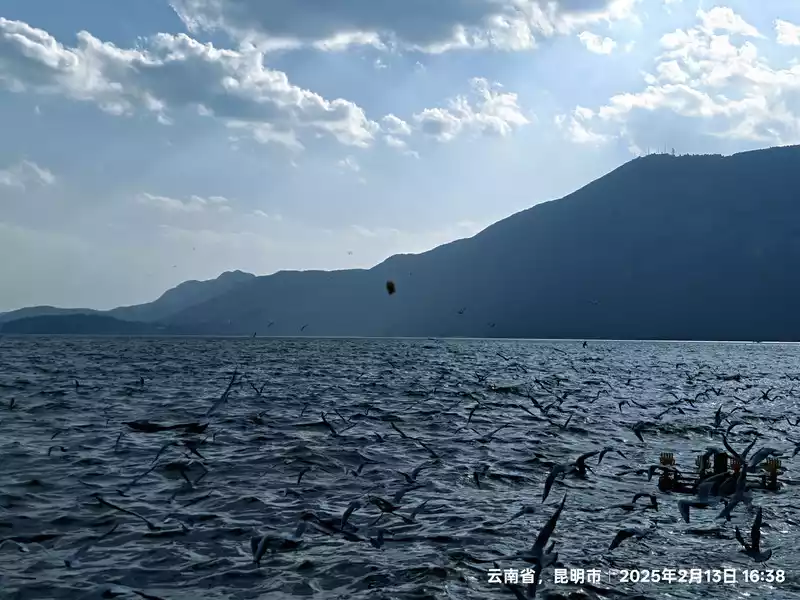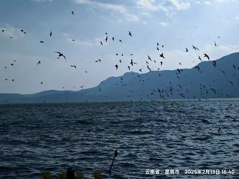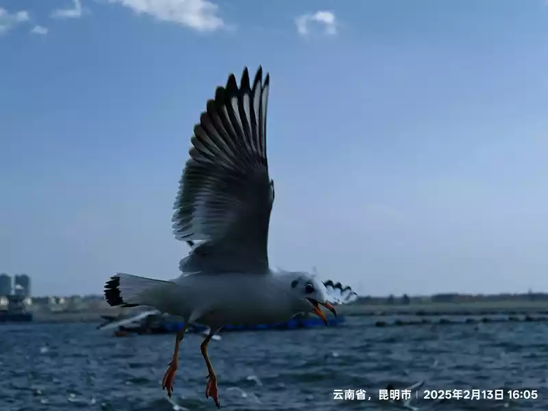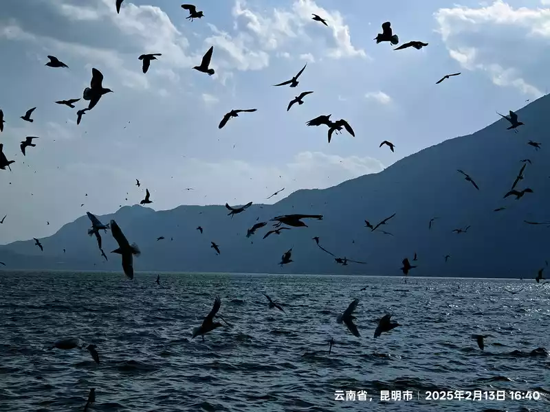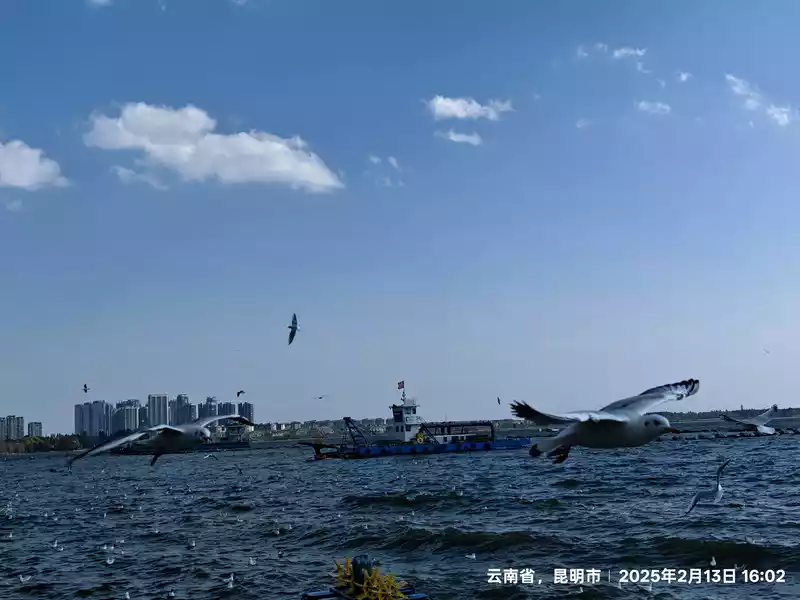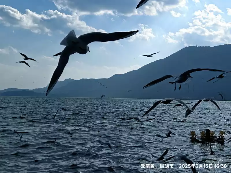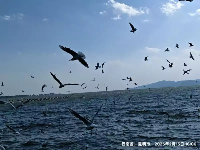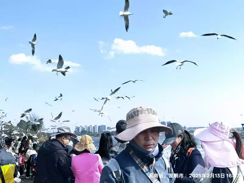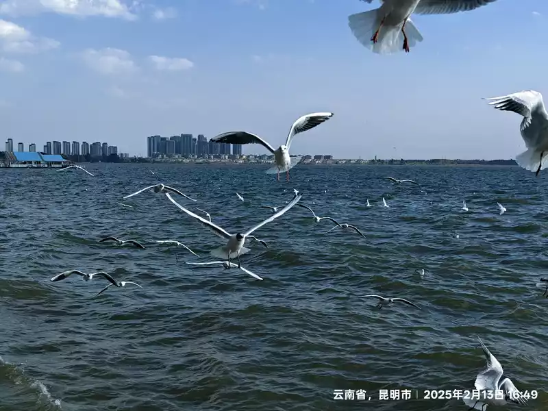 Haigeng Park is not only an ideal place for leisure and entertainment for citizens, but also carries a profound historical and cultural heritage. This was once a famous ferry crossing on the shores of Dianchi Lake, witnessing the development and transformation of Kunming. The park also boasts unique cultural attractions, such as the sea-viewing promenade and cable car, offering visitors panoramic views of Dianchi Lake and the Western Hills. The park is also home to numerous seagulls, stretching endlessly along the water's surface. They create a unique scenic landscape along Kunming's Dianchi Lake, bringing endless joy to visitors and symbolizing the city's warmth in winter. Seagulls are gregarious waterfowl, soaring freely throughout the park, circling, diving, and resting on the lake's surface in a joyful display. Their primary diet is gull food offered by visitors, and whenever food is offered, the gulls scramble to grab it, creating a vibrant and engaging scene.