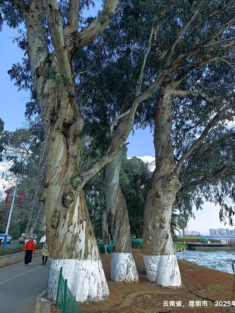 Entering the park, you'll find numerous eucalyptus trees, including two century-old eucalyptus trees intertwined. One tall and straight, the other graceful and graceful, they resemble a pair of devoted lovers, quietly gazing out at Dianchi Lake hand in hand. They've been given the name Lianli Qigan (Lianli Qigan).