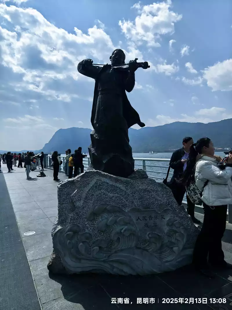 Every year at this time, millions of tourists flock to witness this spectacular spectacle. Spend two yuan for a bag of bird seed, hold out your hand, and the seagulls will gracefully descend to pick at the food—a truly delightful spectacle. Unfortunately, I arrived at noon, so I didn't encounter any flocks of seagulls happily playing with people, nor did I hear their clear cries. I only saw them circling and flying around the cruise ships on Dianchi Lake. I asked the security guard where the seagulls were, but they flew away after feeding. The dam is well-equipped with railings, feature walls, decorative lighting, sculptures, and carved floor tiles. A statue of the renowned musician Nie Er also stands here. I was eager to see the seagulls, but all I saw were crowds of people. Even at the best viewing spot, I couldn't see any fluttering birds, which was a bit disappointing.