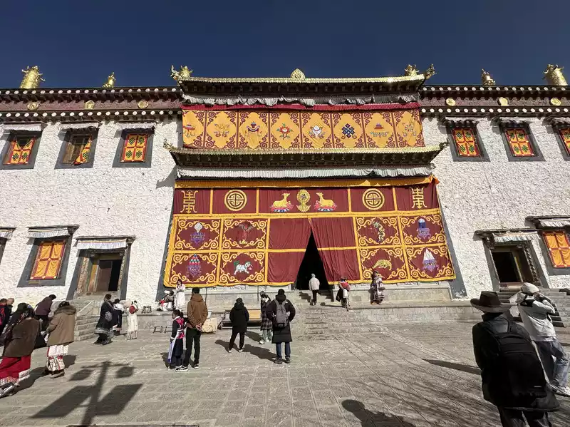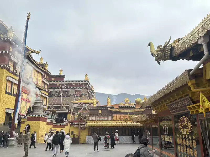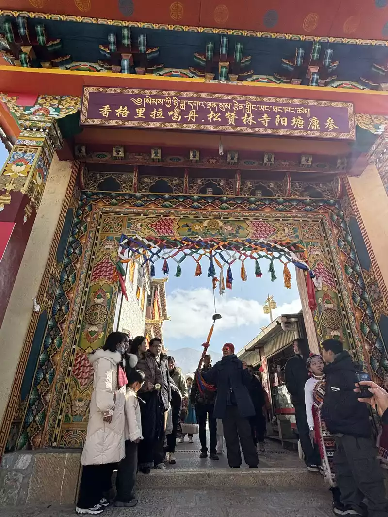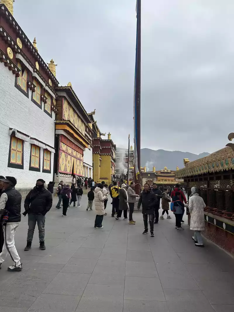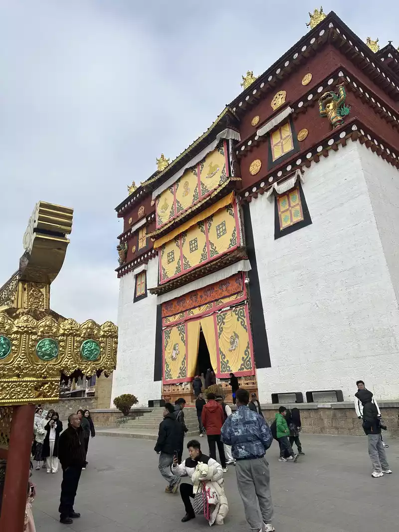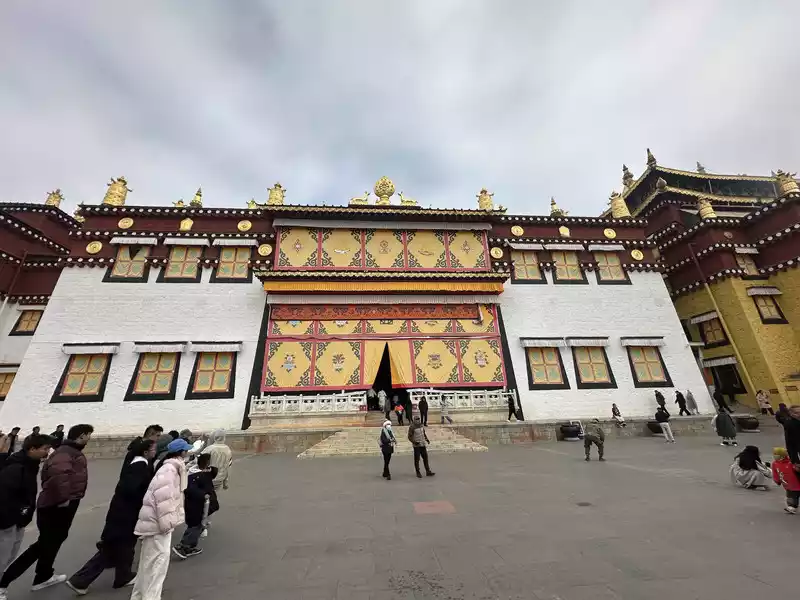 The plaque on the main gate of Songzanlin Temple reads "Ganden Songzanlin Temple" in large characters, which was the name of the temple given by the Fifth Dalai Lama himself. Upon entering the monastery, the guide (including the entrance fee) will provide a brief explanation. He explains that Songzanlin Monastery has no connection to the historical marriage between Han Chinese and Tibetans, Songtsen Gampo. From here, ascending 143 steps, you can explore the temple complex, which consists of the main hall, the Khamchan (a secondary hall, one of eight in the monastery), and the monks' quarters. In addition, there are numerous scripture halls and pagodas, forming a complete and harmonious religious complex. Today, we will focus on three halls dedicated to peace, health, and wisdom, representing the Tibetan Buddhist blessings for all visitors. Please note that the steps should be taken from the left when ascending and from the left when descending. Entering and exiting the temple should proceed clockwise, as clockwise movement is considered a symbol of auspiciousness and perfection in Tibetan Buddhism. Do not take photos or speak loudly while inside the temple. Climb 143 steps. Main Hall, Zhacang Hall
