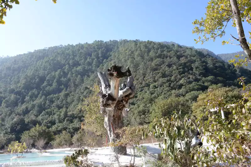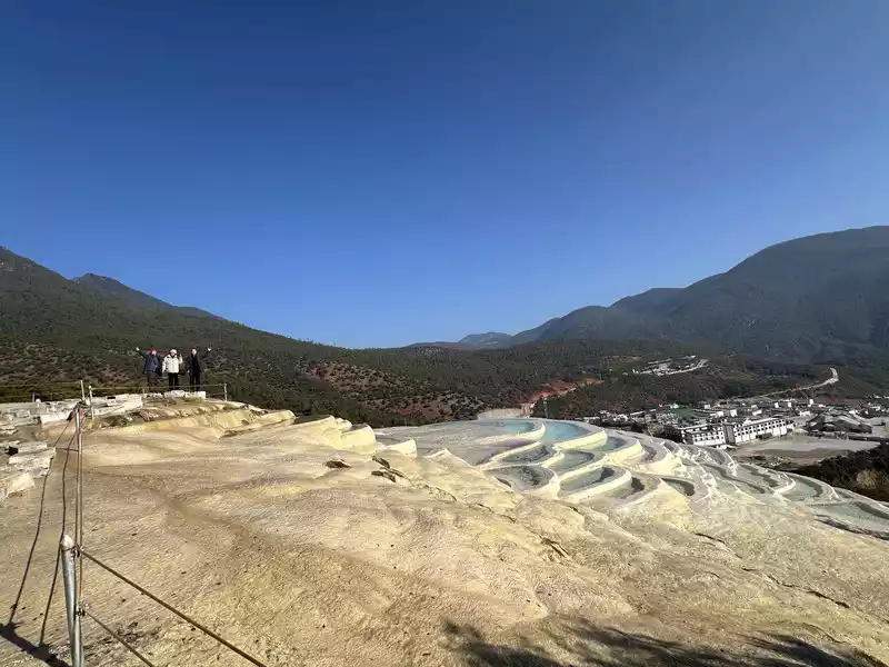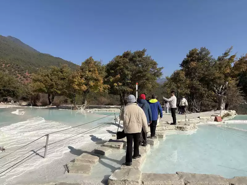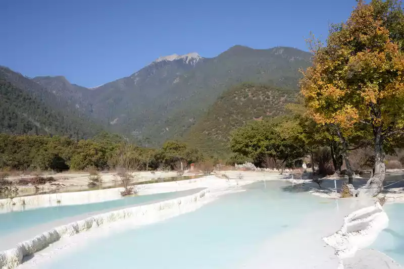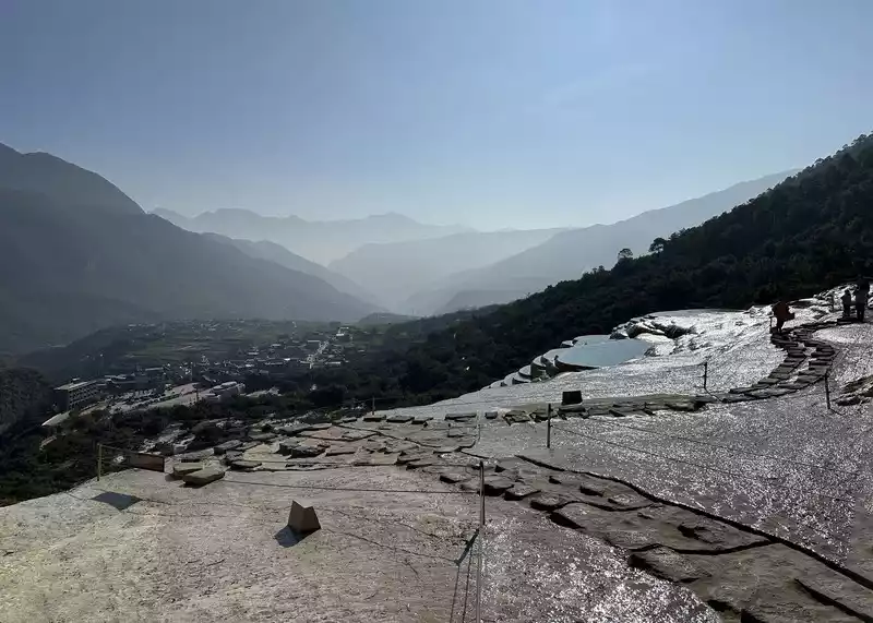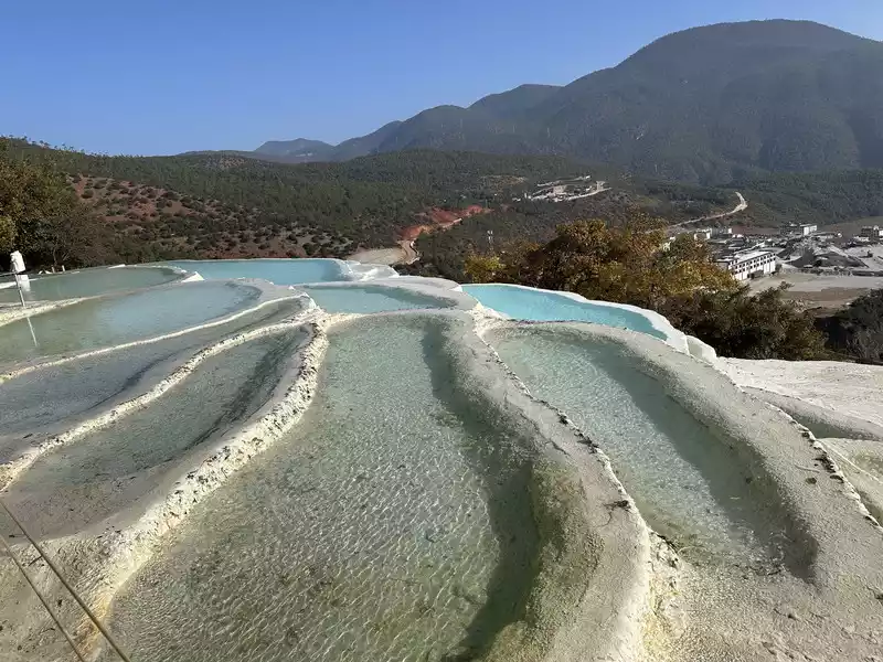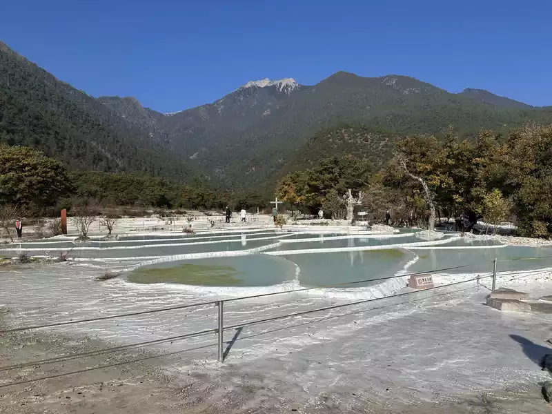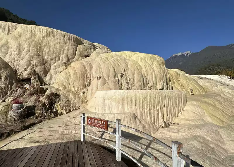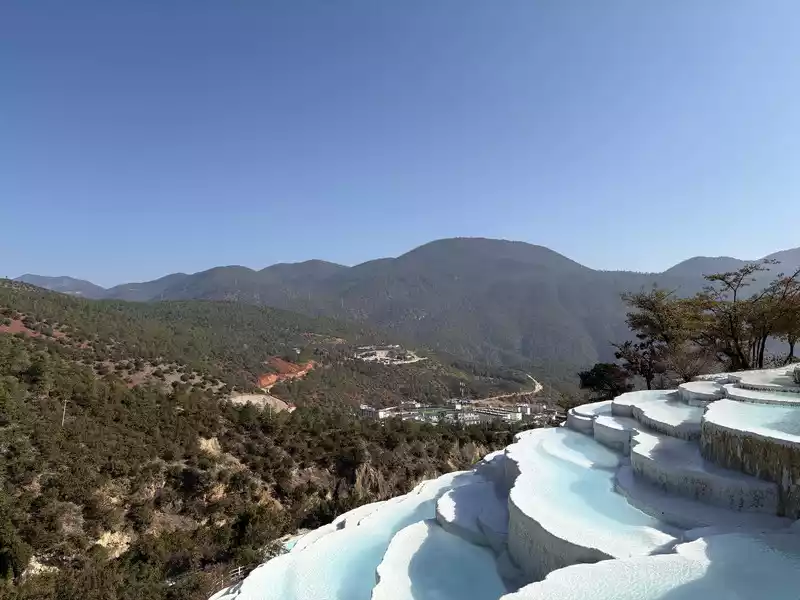Baishuitai is located at the northern foot of Haba Snow Mountain. The platform covers an area of about 3 square kilometers. It is the largest cold spring type freshwater carbonate spring petrification platform discovered in my country so far. Its main cause is that the calcium carbonate dissolved in the spring water decomposes and precipitates after exposure, forming spring petrification. The petrification is stacked layer by layer and is white. It gradually slopes from west to east, like layers of terraced fields. Hence the name Baishuitai, and the beautiful name of "the immortal's abandoned fields".