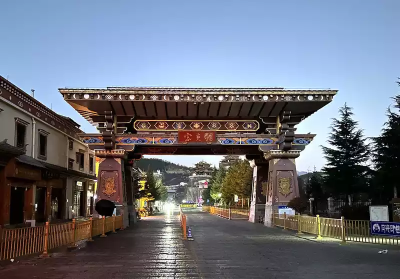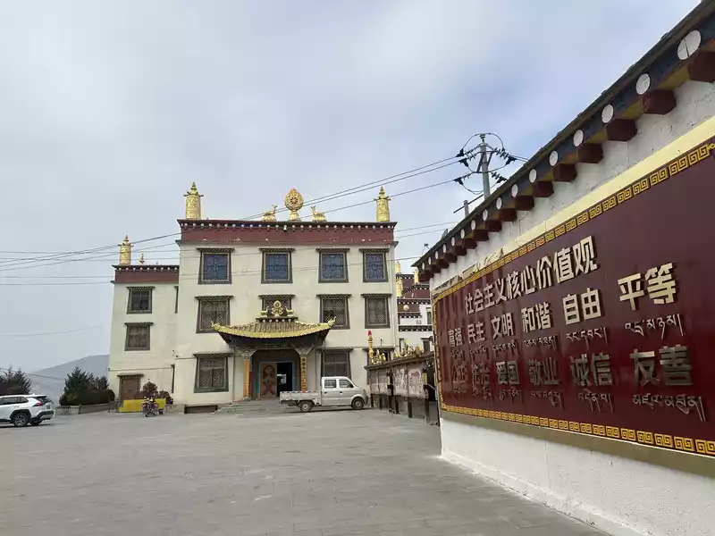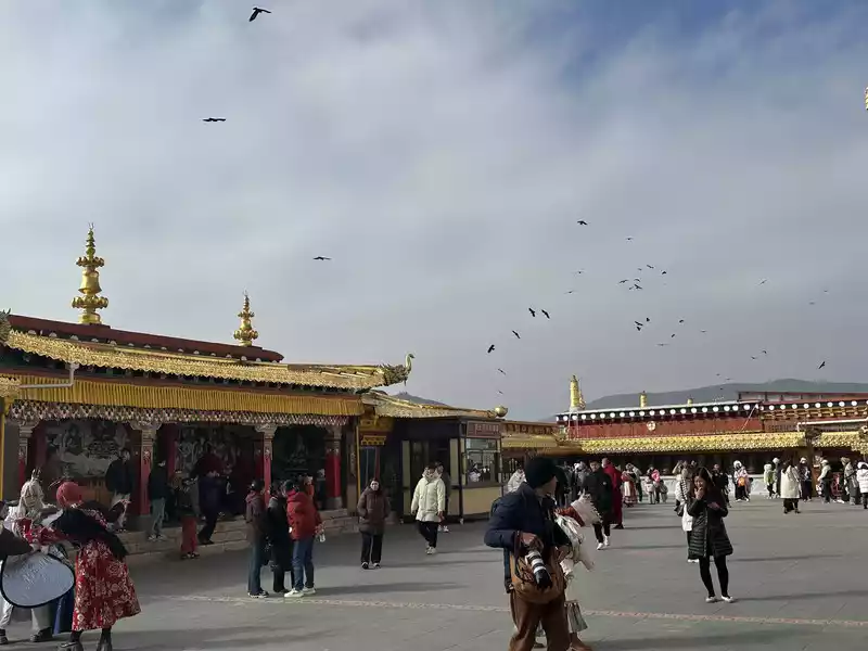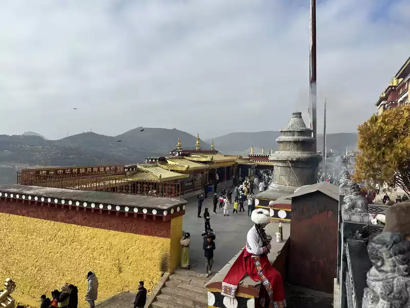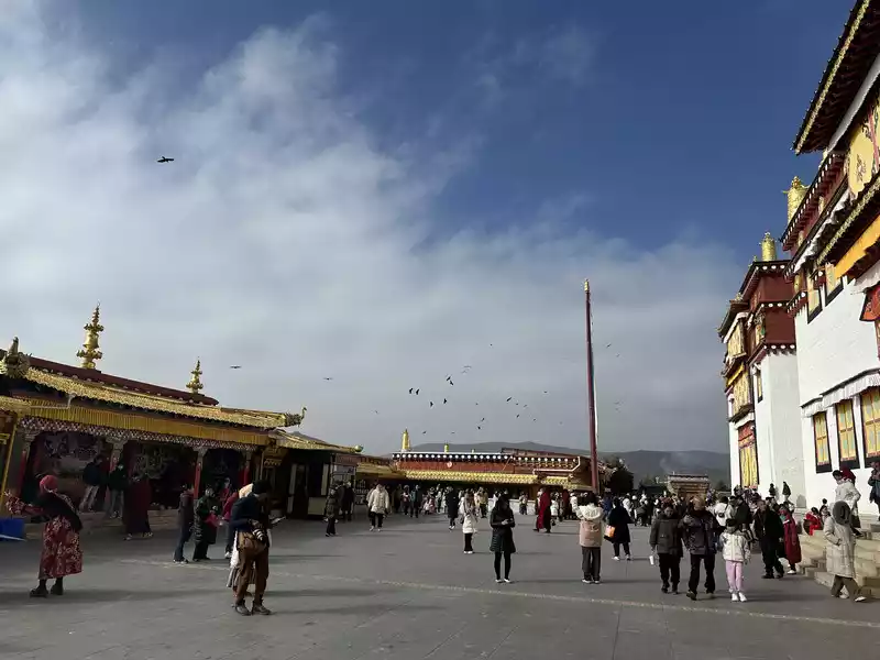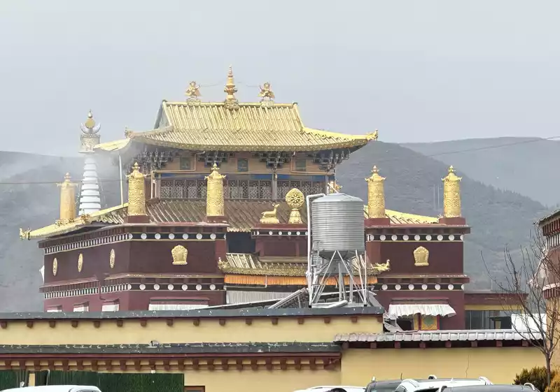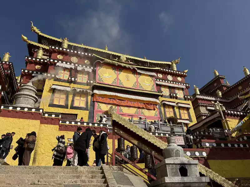 We slowly ascended the high steps, immersed in the cultural atmosphere of Tibetan Buddhism. As we neared the summit, the main hall, Zhacang (meaning "monastery" in Tibetan), appeared before our eyes. Located at the center and highest point of the temple, it faces south, and its five-story Tibetan-style carved building is majestic and magnificent, sacred and solemn. We then arrived at the square in front of the temple. The halls, gilded with copper and featuring animal-shaped eaves, filled us with awe as we stood within this magnificent temple.
