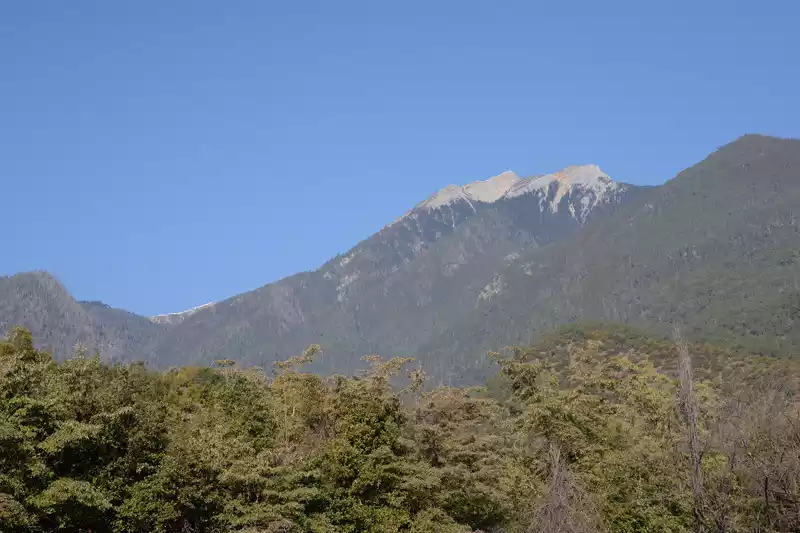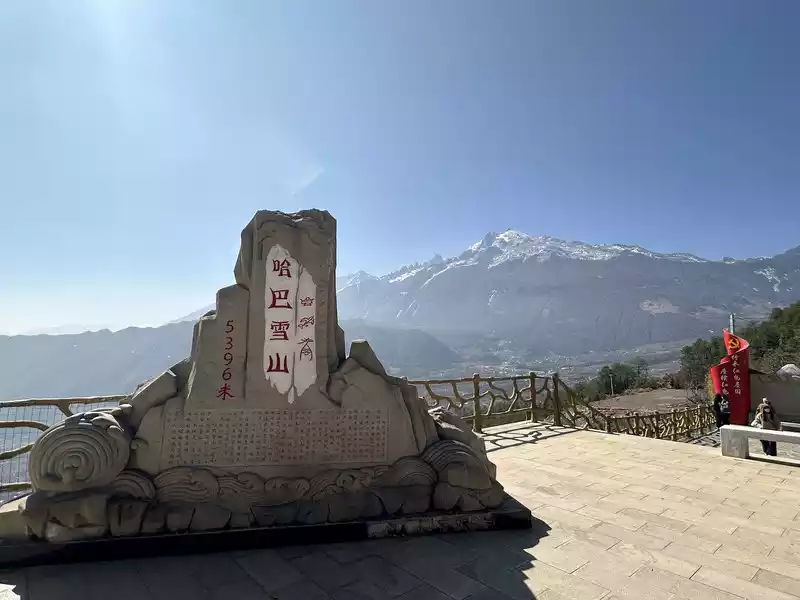 Leave Baishuitai at 10:30 and continue moving forward. We seemed to have entered the territory of Haba Snow Mountain. When we were approaching Tiger Leaping Gorge, we stopped again. This is a classic viewing point to see Haba Snow Mountain. The stone tablet of "Haba Snow Mountain" is very eye-catching. It is marked that the altitude of Haba Snow Mountain is 5,396 meters. From a distance, Haba Snow Mountain is not dangerous, and the top of the mountain is bare. I remembered a myth and legend: Jinsha River, Nu River, Lancang River, Yulong Mountain, and Haba Mountain were originally five brothers and sisters. When the three sisters grew up, they met to choose a son-in-law. Their parents ordered Yulong and Haba to chase them. Jade Dragon, carrying thirteen swords, and Haba, carrying twelve bows, took a small road to Shangri-La. They sat face to face and took turns waiting. They made an agreement that whoever spared the three sisters would be beheaded. Haba's brother spared his sister and was beheaded. The brother cried bitterly, and the two tears turned into white water and black water. Haba's twelve bows turned into the twenty-four bends on both sides of the Tiger Leaping Gorge. Haba's head fell into the river and turned into a Tiger Leaping Stone.