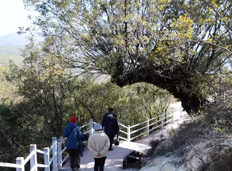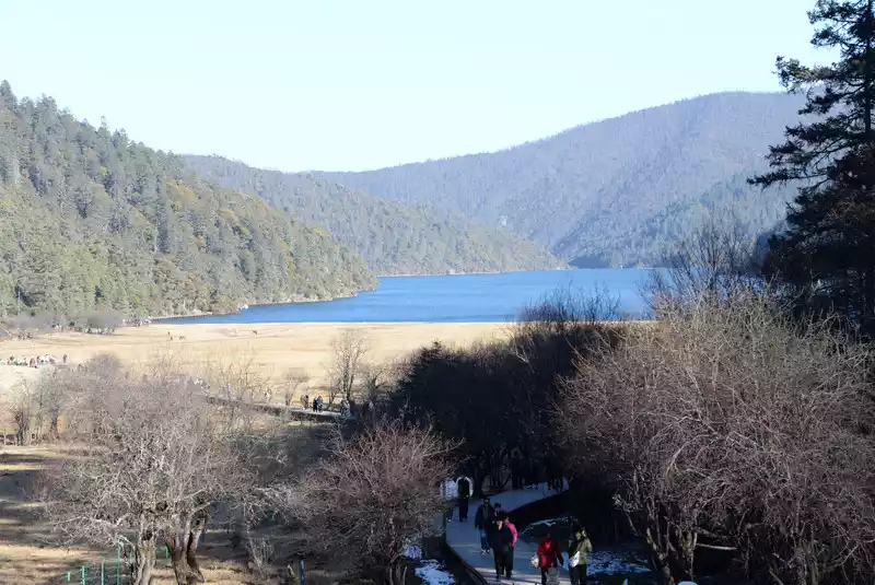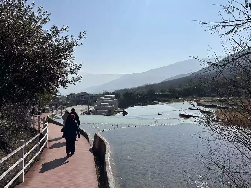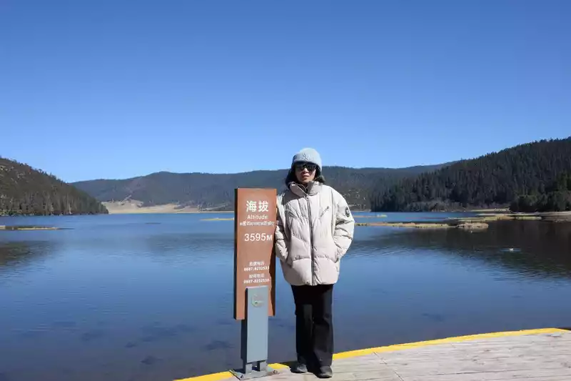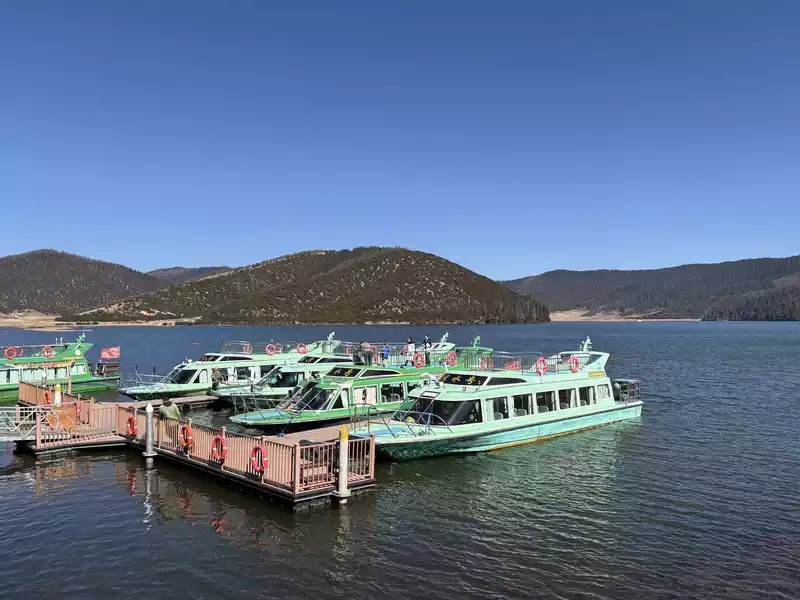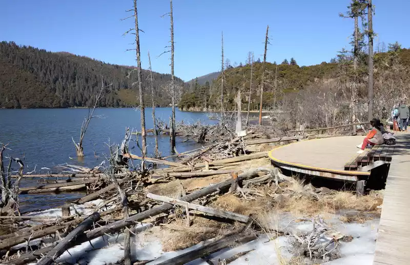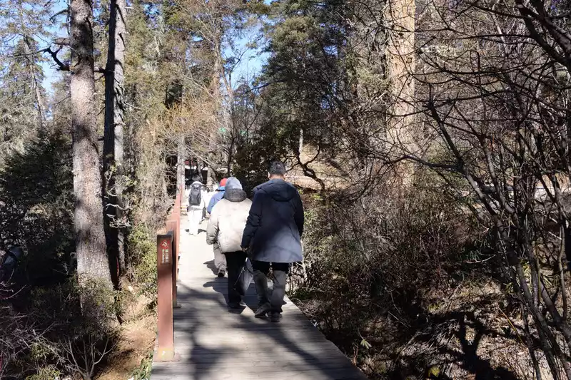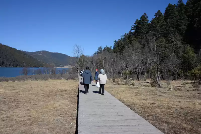 Once you reach the lake, you have two options: take a cruise (65 yuan per person) or walk. Both destinations are at the parking lot on the south bank of Shudu Lake (where you'll catch a bus to the next attraction). We chose to walk to save money and enjoy the scenery. The 3.3-kilometer walk along the wooden boardwalk on the south bank of Shudu Lake took over an hour, enjoying the scenery.
