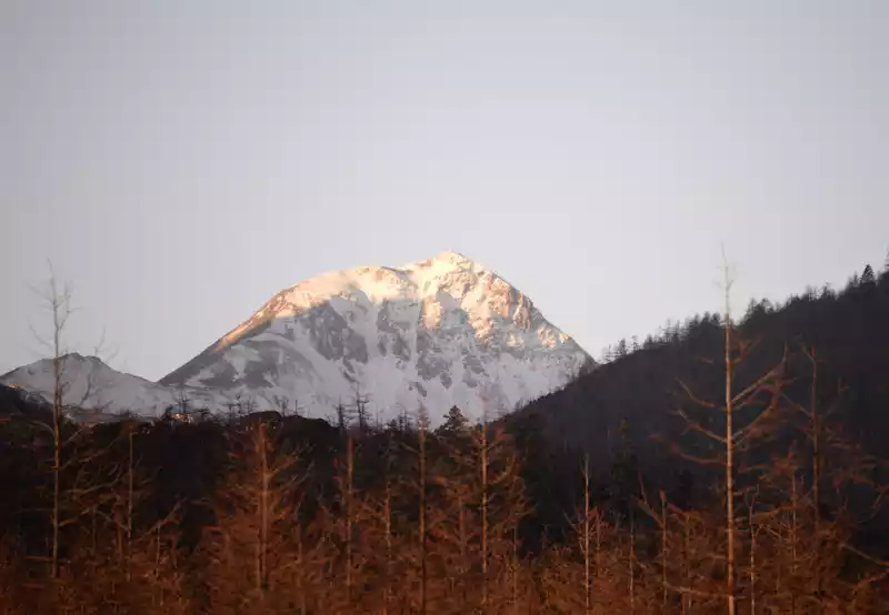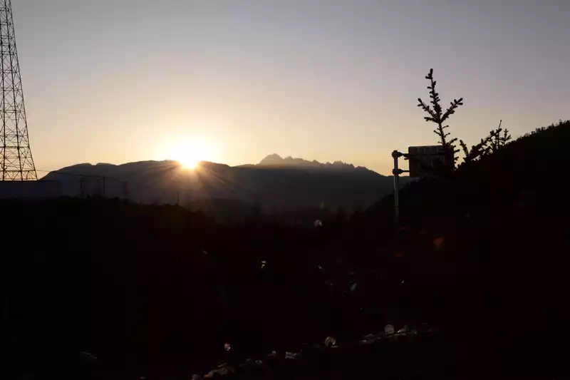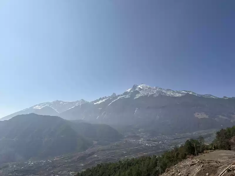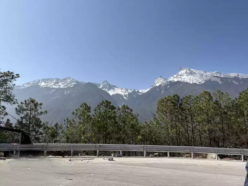 As the car passed through the south gate of the ancient city, I took another photo. At 8:18, we arrived at the "Huxiang Highest Observation Deck" and stopped the car by the roadside to admire the Golden Summit of Haba Snow Mountain.