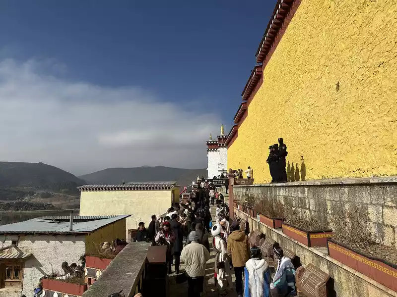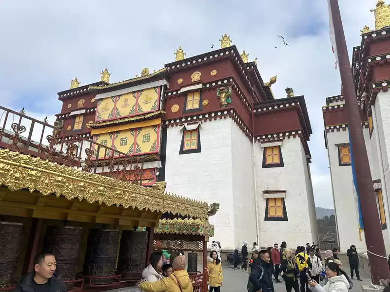 We took the scenic area shuttle bus (tourists are not allowed to drive in) to Songzanlin Temple, but saw that Songzanlin Temple was built on the mountain, high above, shaped like an ancient castle-like building complex. Looking from below, the numerous buildings were staggered and progressive, splendid, magnificent and very majestic.