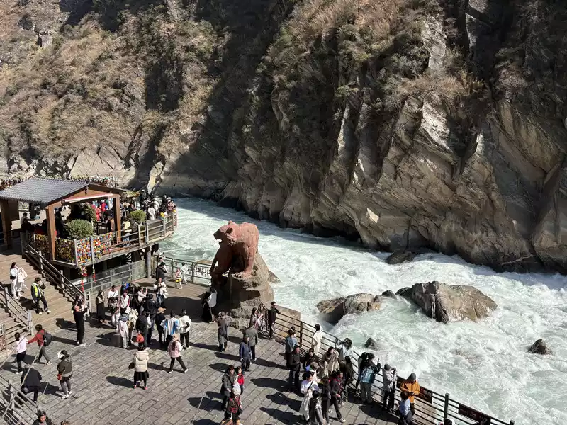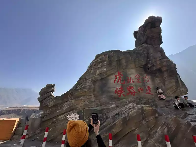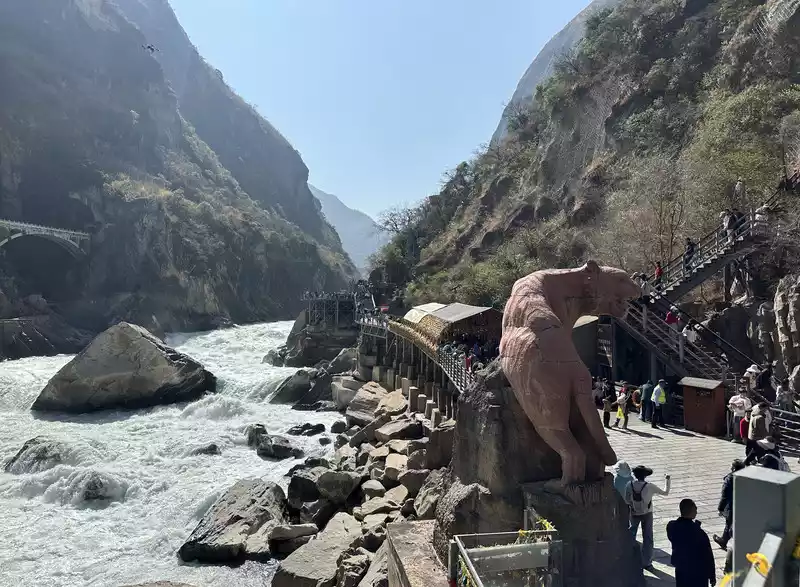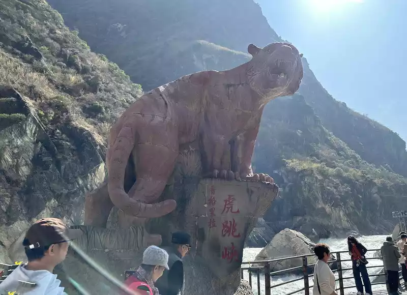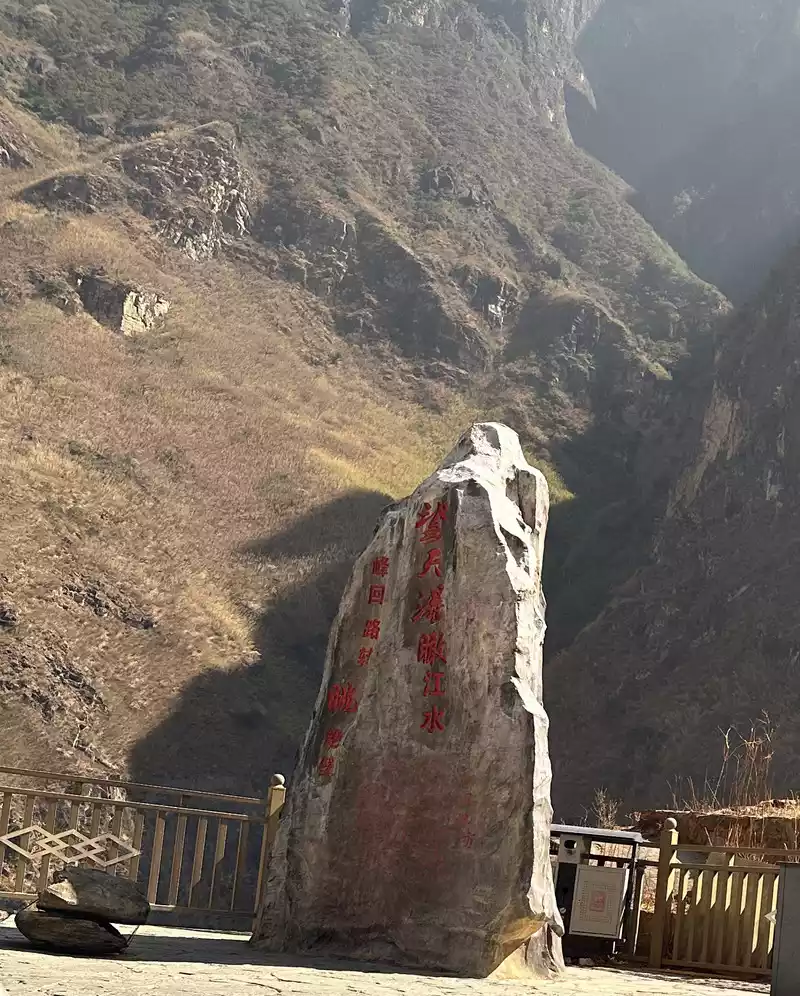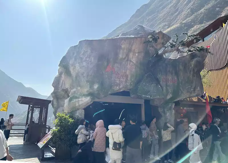 Entering Xiahutiao, the first thing you see is a large stone sculpture in the shape of a tiger, with the inscription "Tiger Leaping across the Golden Sands, We Meet on a Narrow Road". Many people check in here. Then we looked at Wangtian Waterfall, and we saw the mountains on both sides of the river, the valley slopes are steep, and the river is far away from the bottom of the abyss.