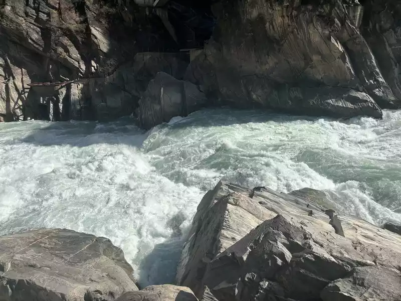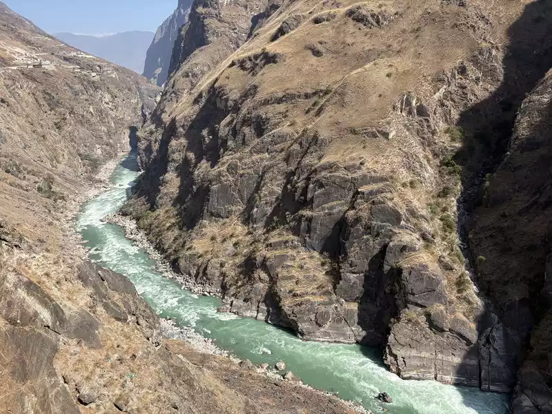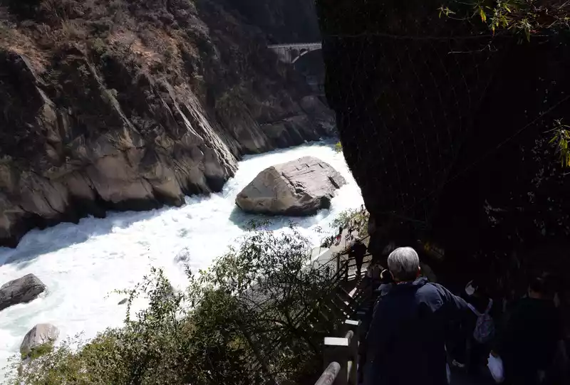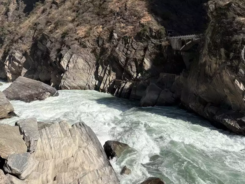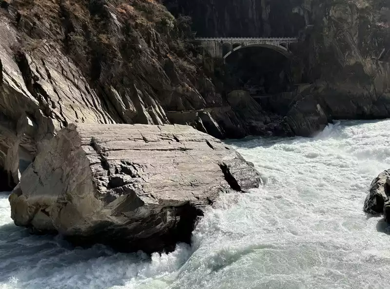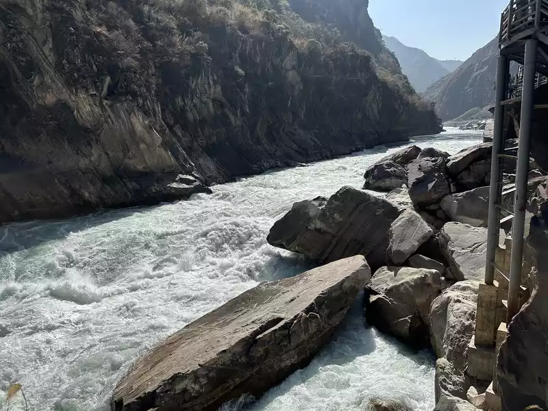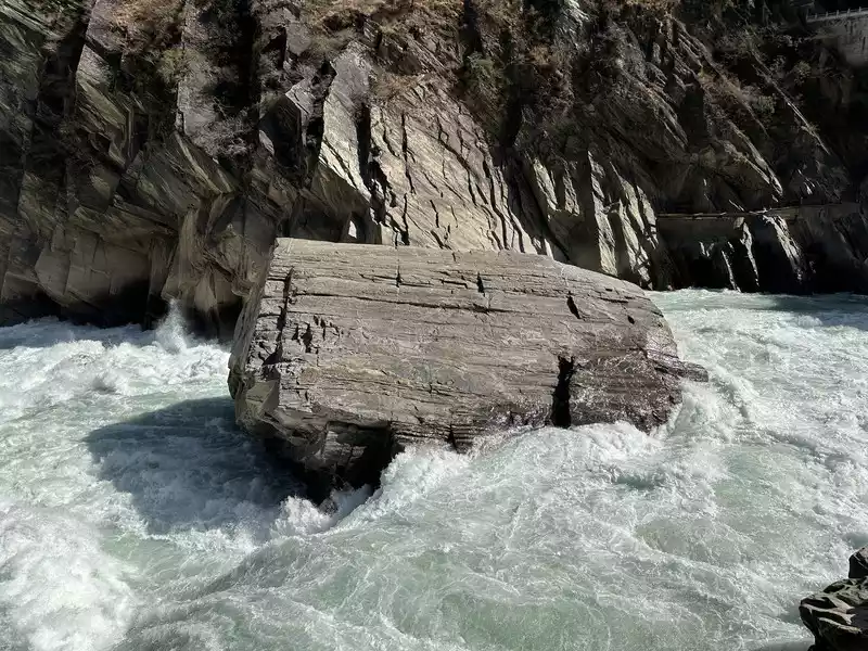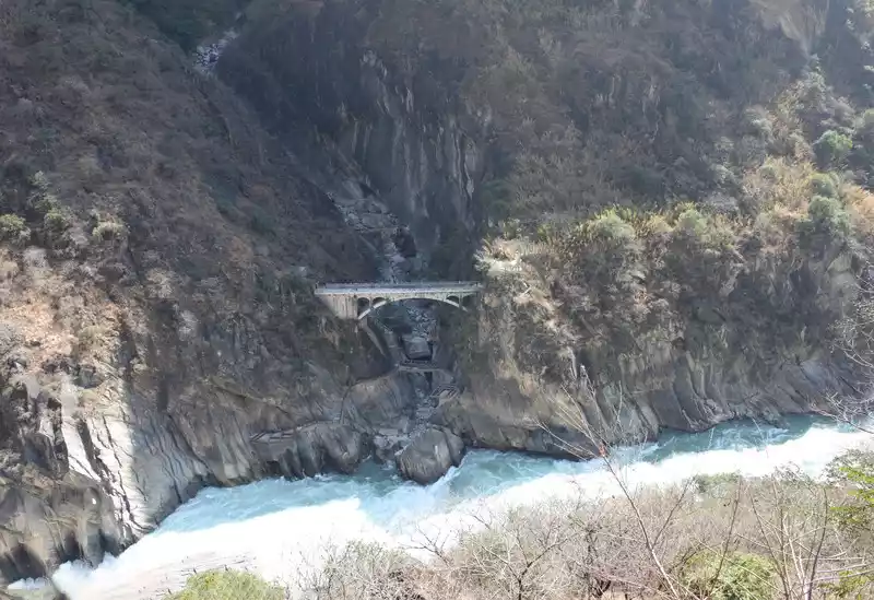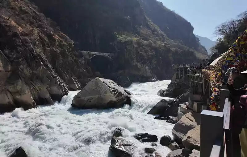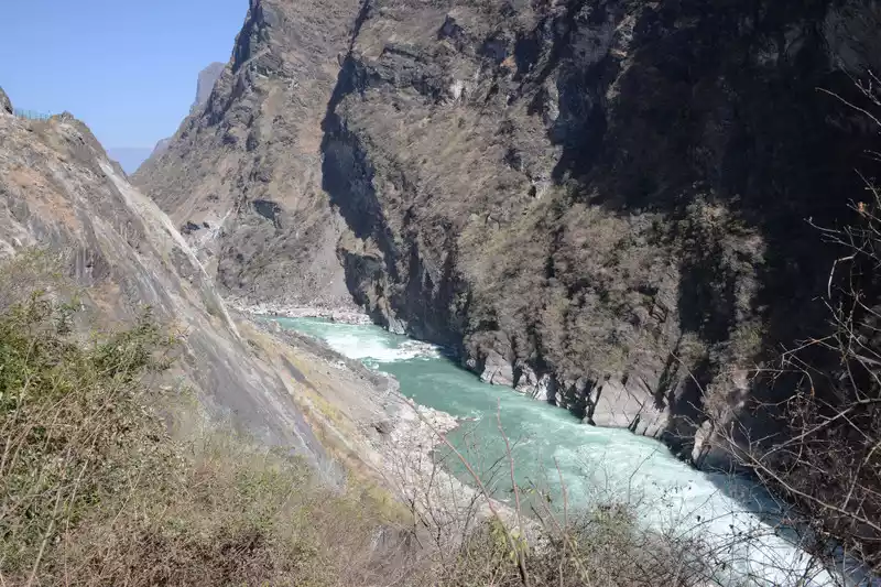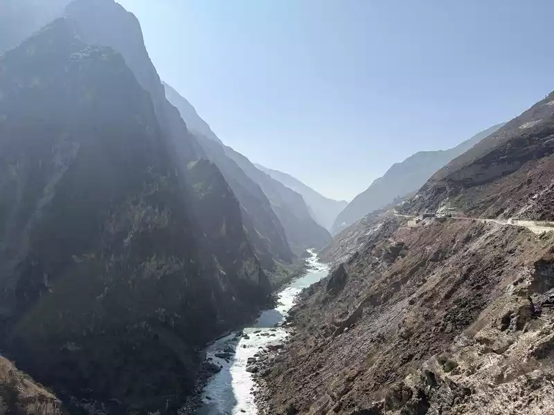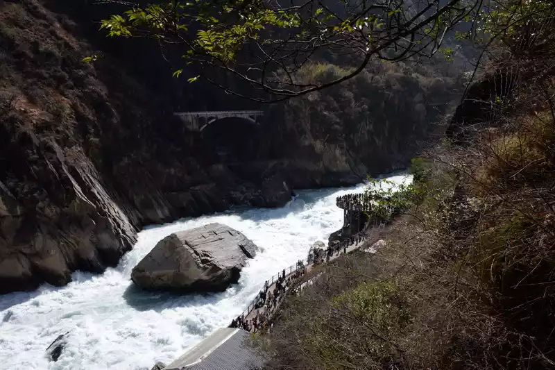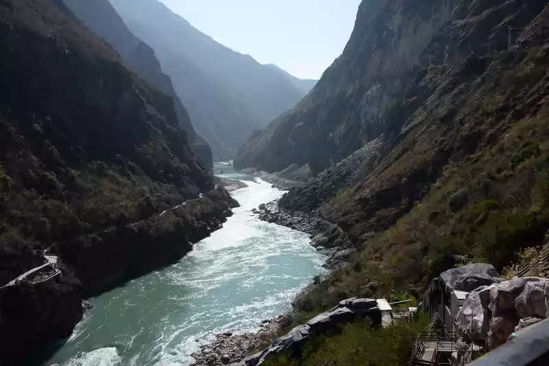 Hutiao Gorge can be divided into three sections: Upper Tiger Leaping, Middle Tiger Leaping and Lower Tiger Leaping. It has a total length of 17 kilometers, 25 kilometers of circuitous roads, a canyon drop of 213 meters, and a vertical height difference of more than 3,900 meters. It is more than 1,500 meters deeper than the Colorado Grand Canyon in the United States. It is one of the deepest canyons in the world. Tightly bound by the mountains on both sides, the river is only over 50 meters wide after entering the gorge. At the narrowest point, tigers and leopards can jump across it with the help of the Tiger Leaping Stone, hence the name Tiger Leaping Gorge.