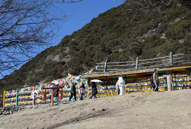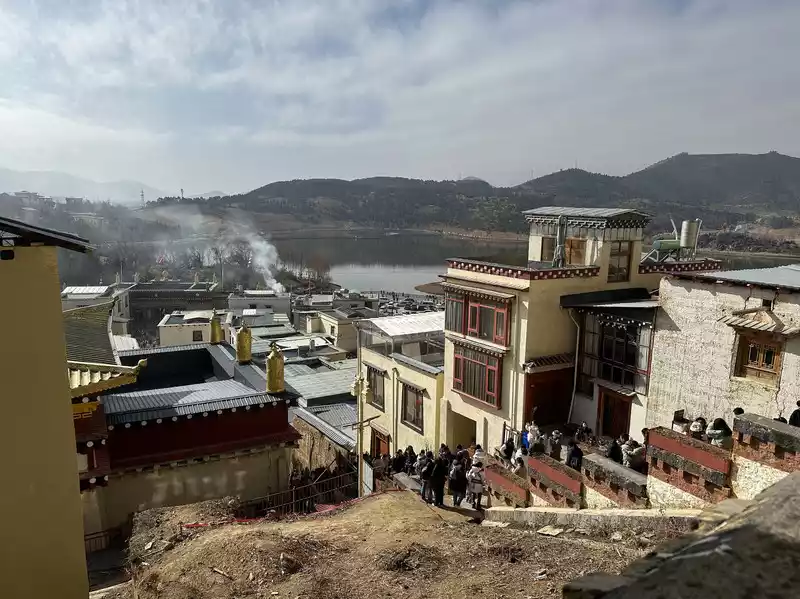 After the tour, we arrived at a prayer wheel. Many people lined up to spin it. The tour guide said we had to spin it three times for blessings, so we joined in. We took some photos and then headed down the mountain. We saw several police officers standing on a platform to ensure safety. There were large monasteries on the hillside. The tour guide explained that these monasteries were built by the monks themselves. The wealthy built better ones, while those with less money built less. Here, monks are the pride of their families, and they are supported by their families.