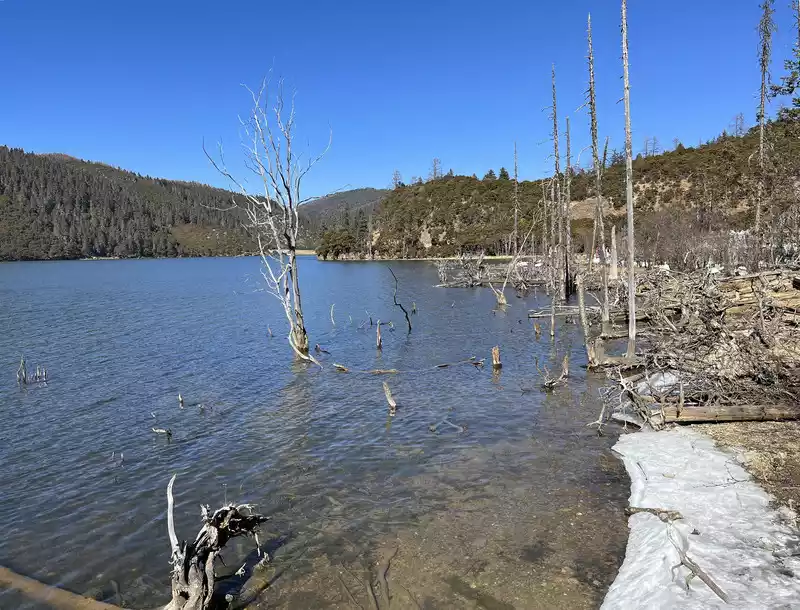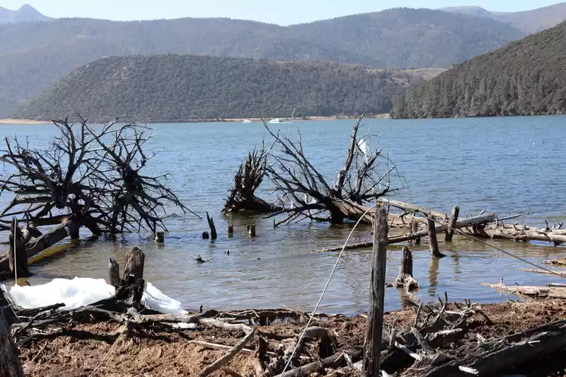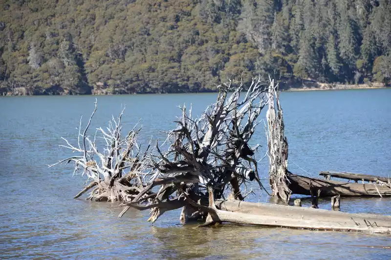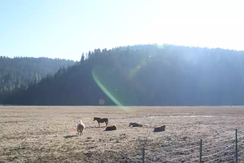 Shudu Lake has a nice scenery. The lake is vast, the grassland is lush, the green mountains are verdant all around, and the primeval forest covers the shore. Cattle and horses sometimes roam around the lake, and dead branches and rotten trees also become a scene.
