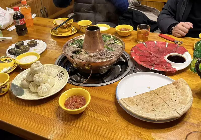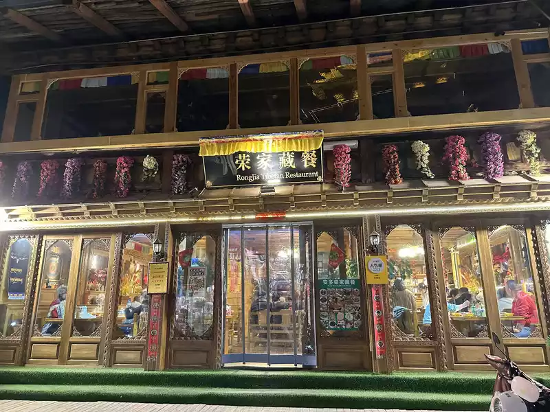 A little after 7 p.m., our night tour of Dukezong Ancient Town officially began. The hotel is a 10-minute walk from Moonlight Square in the heart of the ancient town, and we quickly entered the ancient town. We first had dinner at Rongjia Tibetan Restaurant, also in the old town. We ordered Tibetan hot pot, yak sashimi, Tibetan pizza, grilled mushrooms, yak beef buns, and Songga beer, totaling over 300 yuan. Next door to Rongjia Tibetan Restaurant is Cun's Silver Shop, which we visited after dinner. Cun's is a renowned Yunnan silversmith, renowned for its reputation and quality. My wife saw a silver bracelet she liked. It was 14.8 yuan per gram, a good price, but she already had one. She was hesitant about buying it, but the shop owner said, "You already have one, so there's no need to buy another." Is that how you do business? You could say, "I'll buy another one to keep as a rotation." So, I bought it.