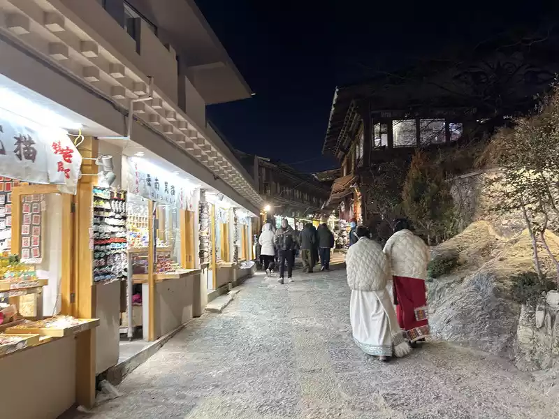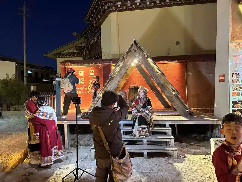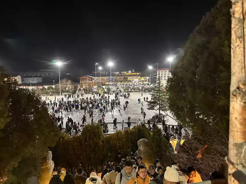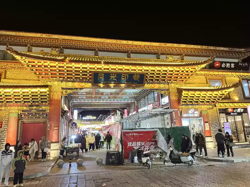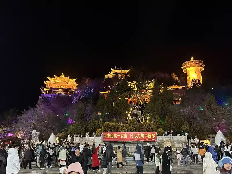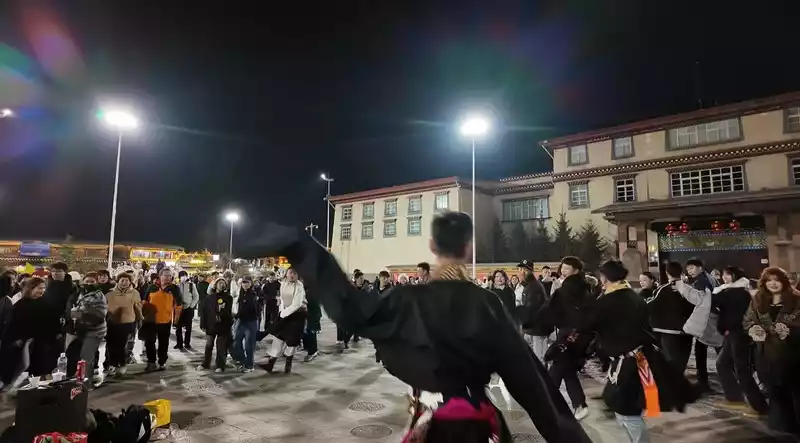 After Guishan Park, you'll find Moonlight Square, where local residents and tourists stroll and relax. As music plays, Tibetans and tourists of various ethnic groups circle around, dancing enthusiastically to Tibetan dances, both those who know how to dance and those who don't. People couldn't help but join in the dance, forming a circle and dancing passionately, creating a beautiful landscape of national unity.