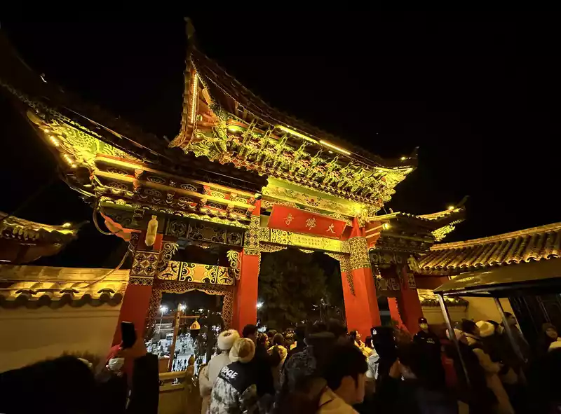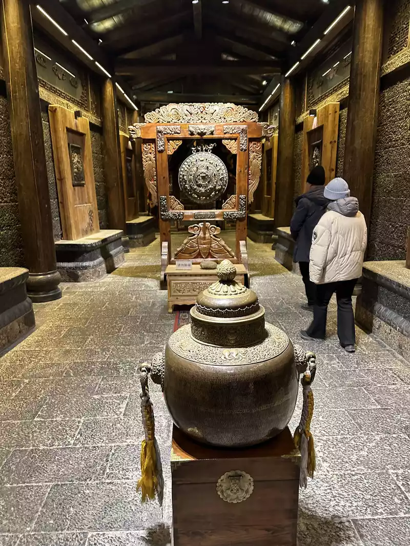 As you circle the Han Temple from left to right, you'll arrive at the world's largest prayer wheel. Looking up, you'll see it's about five stories high, 10 meters in diameter, and 31.4 meters in circumference. It's a majestic sight, made of pure copper plated with gold. The upper part of the wheel is engraved with reliefs depicting the four great bodhisattvas: Manjusri, Samantabhadra, Guanyin, and Ksitigarbha, while the lower part is inscribed with the Eight Treasures of Buddhism. Crowds of tourists are spinning the giant prayer wheel. They believe that each rotation is equivalent to silently chanting the Buddha's name 1.24 million times. Three complete rotations bring blessings and good luck, and good fortune. The world's largest prayer wheel is right before your eyes. The Eight Treasures pattern on the bottom of the prayer wheel is clearly visible. The prayer wheel is surrounded by a huge crowd. src="https://dimg04.c-ctrip.com/images/1mf1t12000jcochkwD299_R_800_10000_Q90.jpg?proc=autoorient" /> Turn three times full of good luck