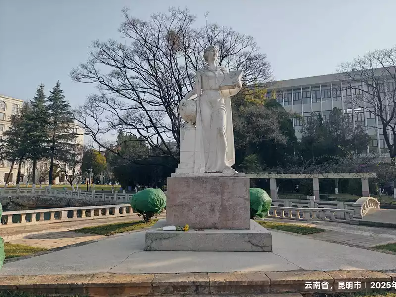 There is an inkstone pond on the other side of the campus, named after the two big characters "inkstone" written by calligrapher Mr. Yang Xiupin. The inkstone pond was originally one of the natural pools on the campus of the United University, and was planned and designed by Liang Sicheng and Lin Huiyin to become one of the water systems on the campus of Southwest Associated University. It is surrounded by stone railings on the outside, and there is a pool of clear water inside, and a white statue of a female teacher stands quietly in the center.