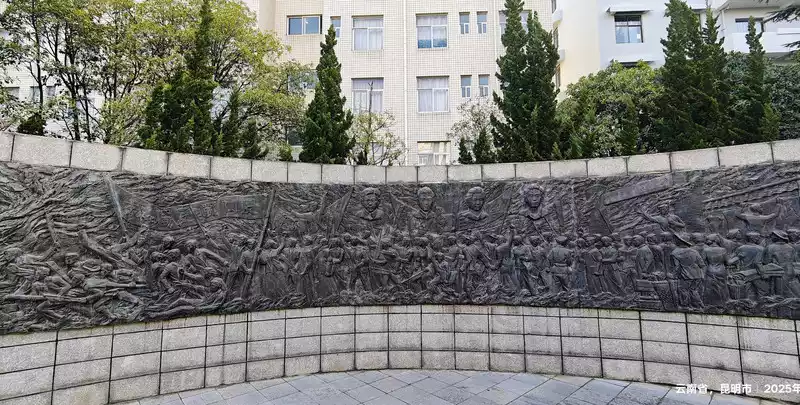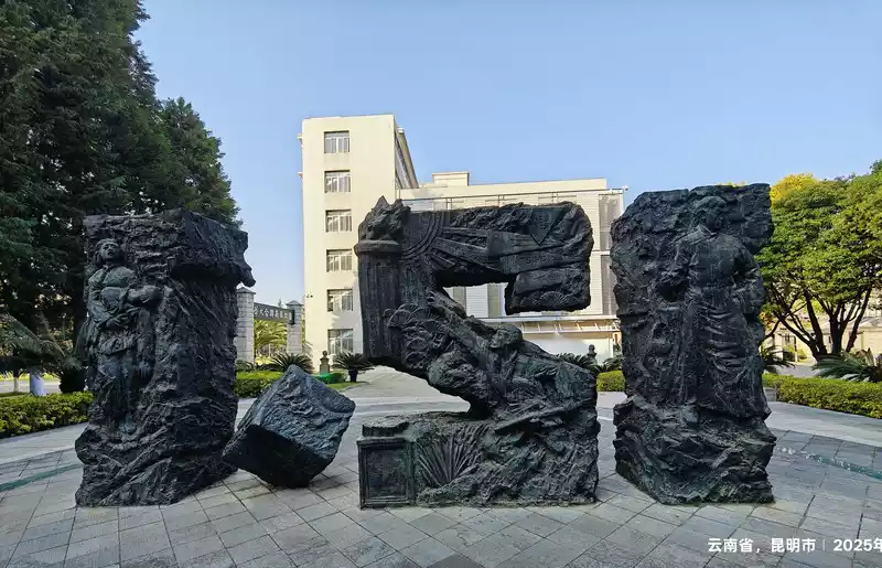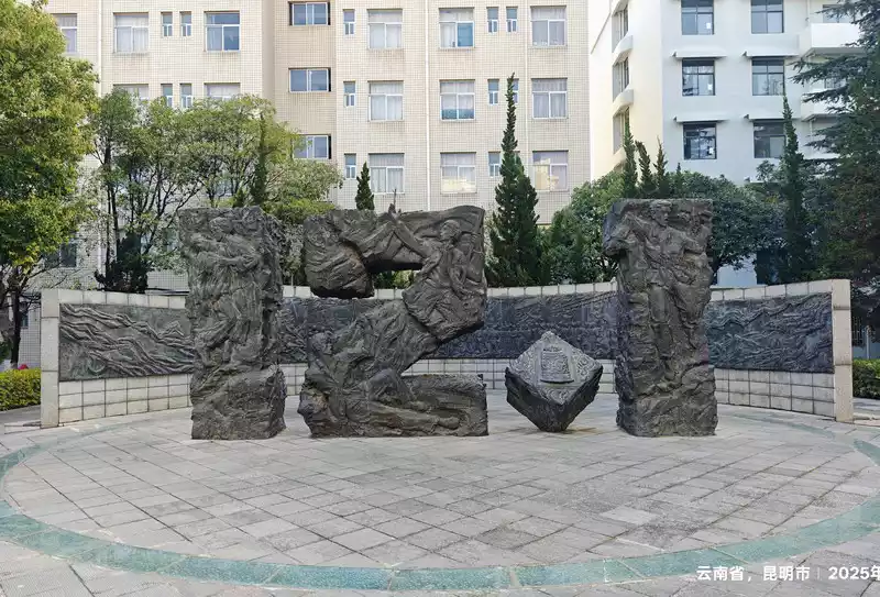 To the right of the gate is the "12.1" Movement Memorial Square. The form of the sky is round, and there are bronze sculptures of "12.1" on the circular stone platform in the middle. The front of the bronze sculpture has a relief of the "12.1" sports scene, and the back has the emblem of Southwest Associated University, the flag of Peking University, Tsinghua University and Nankai University. The relief embedded in the semicircular wall behind the bronze sculpture is the scene of students marching on the streets holding anti-civil war slogans high in the "12.1" movement; The back of the wall is engraved with the full text of "The Beginning and End of the "12.1" Movement written by Mr. Wen Yiduo.