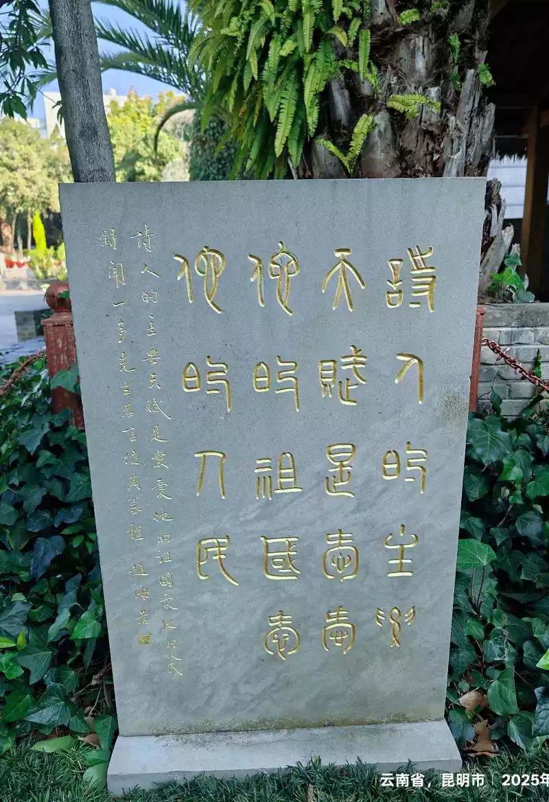 There is a group of statues of Shilin in the lawn, and the images of teachers depicted are standing and sitting, with different expressions, as if discussing an academic issue. There is also a book-shaped red granite rock engraved with "Shilin Ji". Shilin, which means master like a forest, records the outstanding contributions of professors of Southwest Associated University to the United University. There is also a piece of granite on the opposite side engraved with the list of professors of Southwest Associated University. Because the automatic water sprinkler has been spraying water on the grass, it cannot be approached.