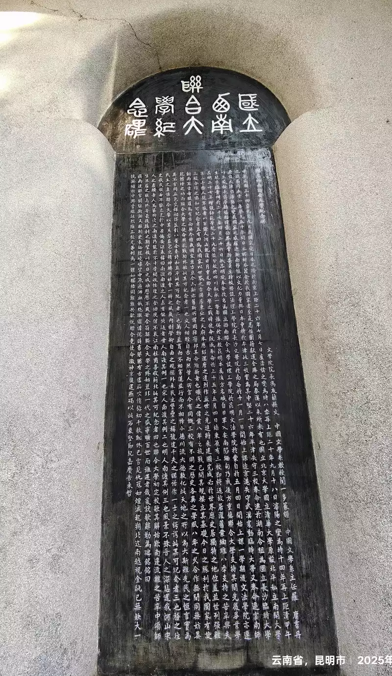 According to the inscription, in 1937, the Lugou Bridge Incident, the Japanese invaded the south, and Pingjin was in an emergency, and the three famous schools of Peking University, Tsinghua University, and Nankai were ordered to move to Hunan and form a temporary university in Changsha. Later, the situation became more difficult, Shanghai and Nanjing fell into enemy hands one after another, Wuhan was shaken, and the temporary university was moved to Yunnan. Hundreds of teachers and students traveled south in batches, most of them walked 3,000 miles, some teachers and students took cars and boats, and some even took a detour to Hong Kong, from Hong Kong through Vietnam, after more than two months of arduous trekking, they arrived in Kunming in the early summer of 1938, changed their name to "Southwest United University", and started classes on May 4. The school is divided into a science and technology college, located in Kunming; set up a grammar school, located in Mengzi; In the winter of the same year, a normal college was added. After one semester, the grammar school moved back to Kunming. On May 4, 1946, the United Nations University ended, and the three universities moved back to Pingjin, which lasted for 8 years.