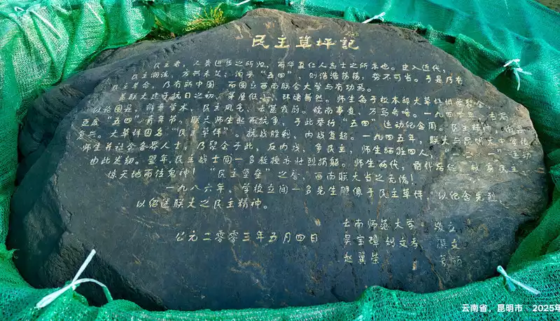statue of Wen Yiduo was seen on the lawn not far away, and in front of the statue was a stone engraved with "Democracy Lawn Theory". The Democracy Lawn was a place where teachers and students discussed academics and promoted democracy. It was also the opening place of the famous 121 movement.