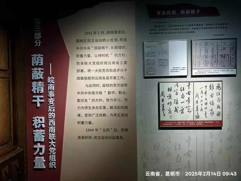 The museum's exhibition focuses on the history of Southwest Associated University, organized chronologically and in sections. It covers the early years of Peking University, Tsinghua University, and Nankai University, their joint history during the Anti-Japanese War, and the post-war restoration of the three universities and the legacy of the Normal College remaining independent in Kunming, extending to the present day, spanning a century.