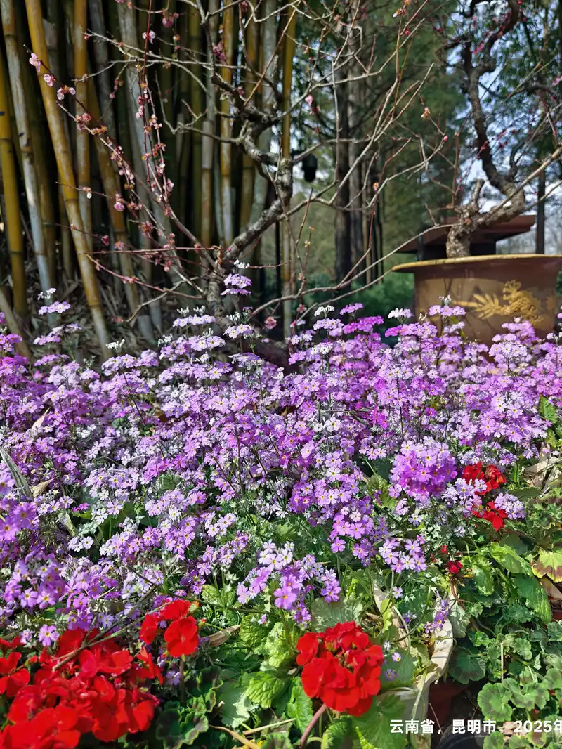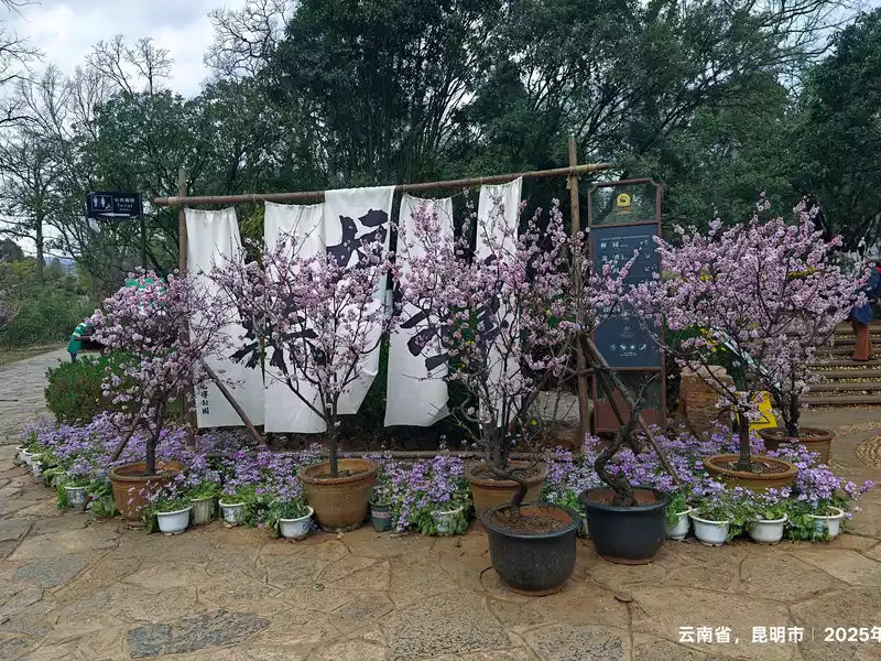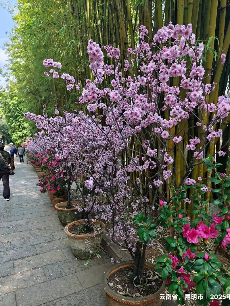In the small roadside flower beds, peacocks are considered Yunnan's mascot, and peacocks made of flowers can be seen everywhere. Finally, we arrived at Black Dragon Pool Park! I figured since there was a plum blossom exhibition, I'd need a ticket. I approached the security guard, but he waved me right in. What a surprise!