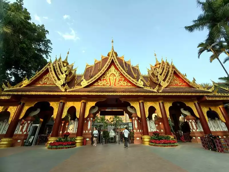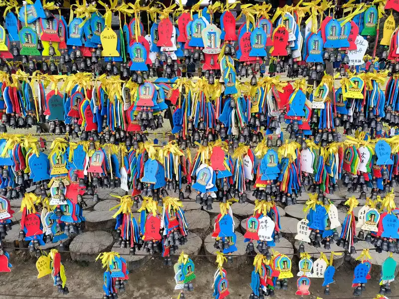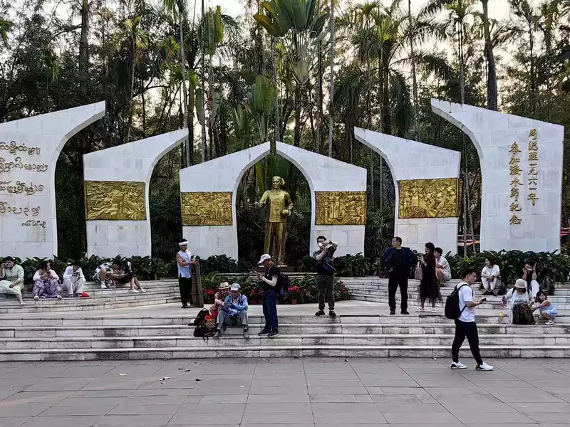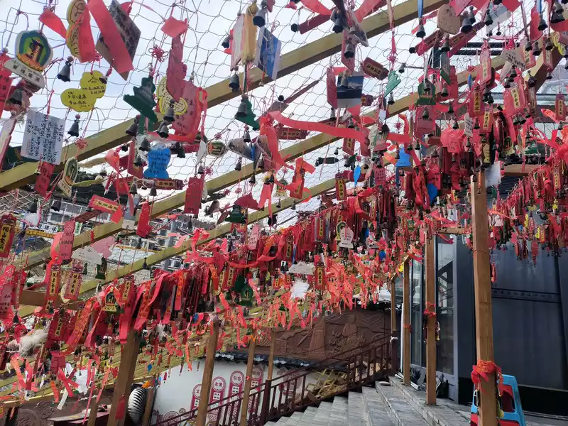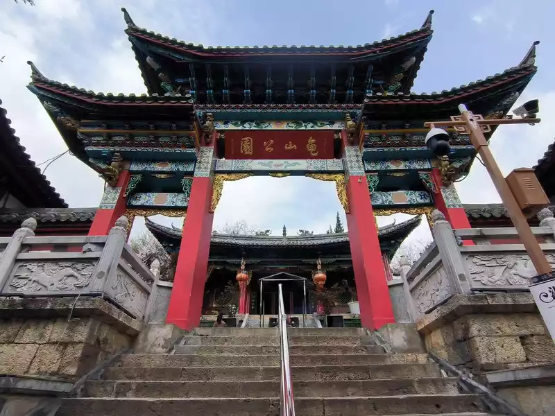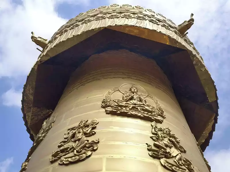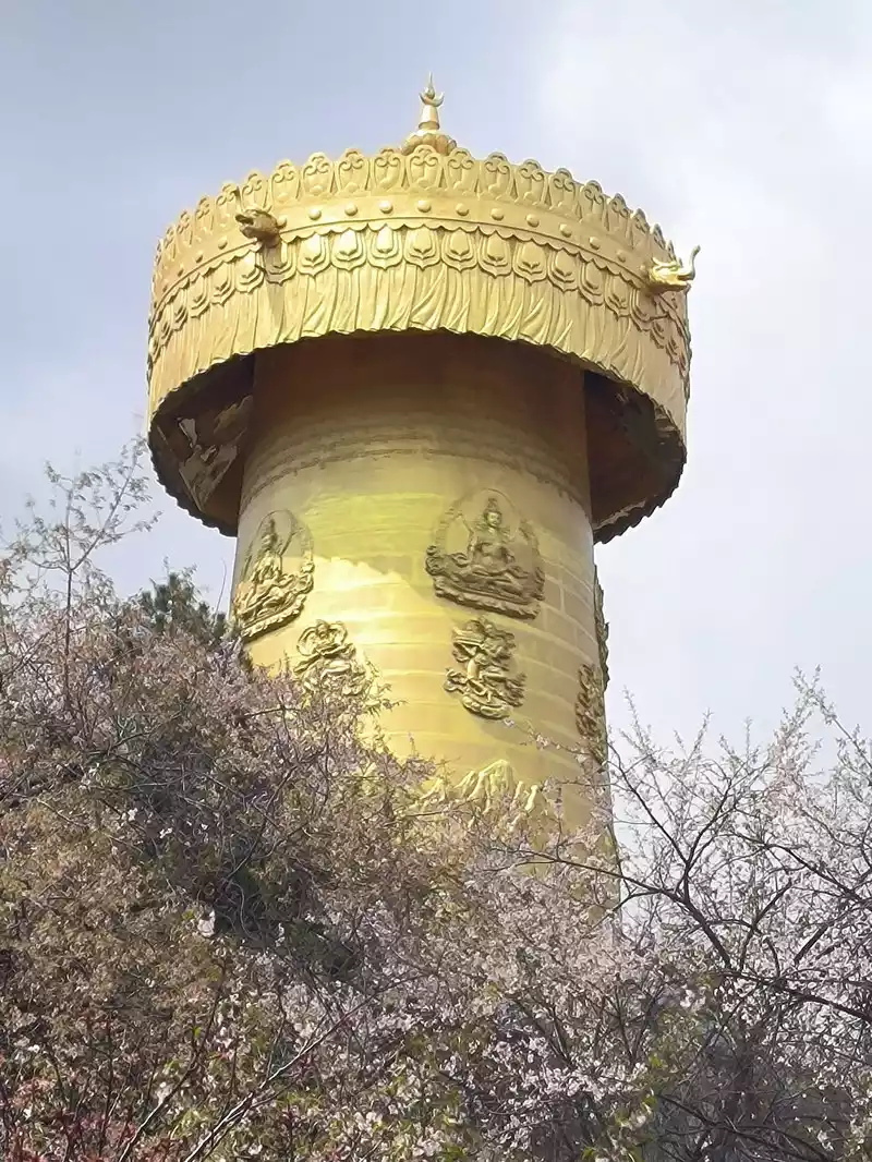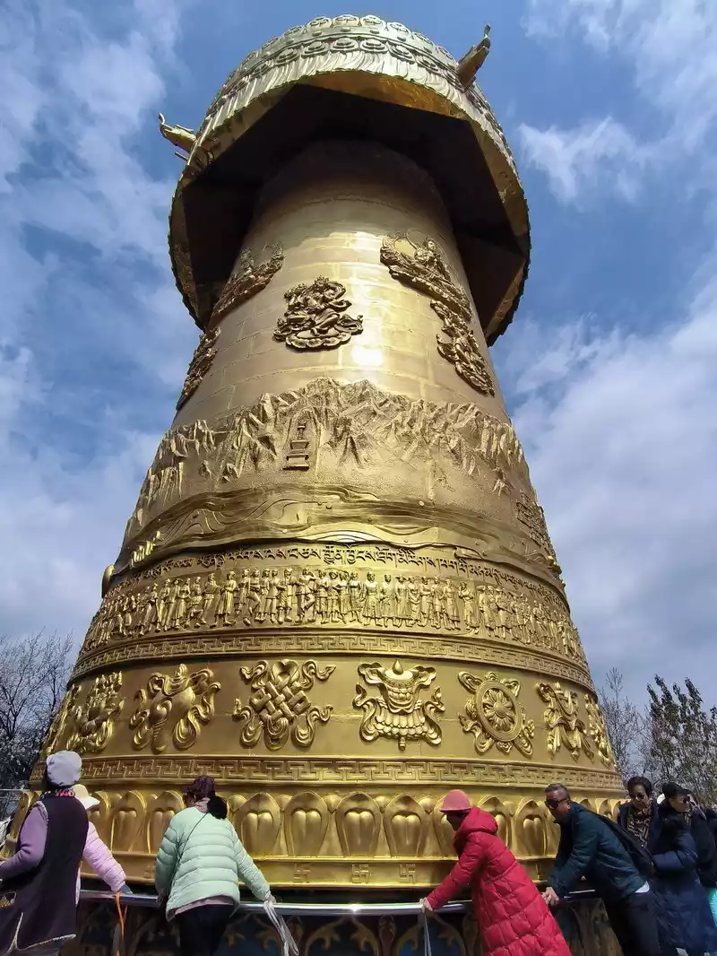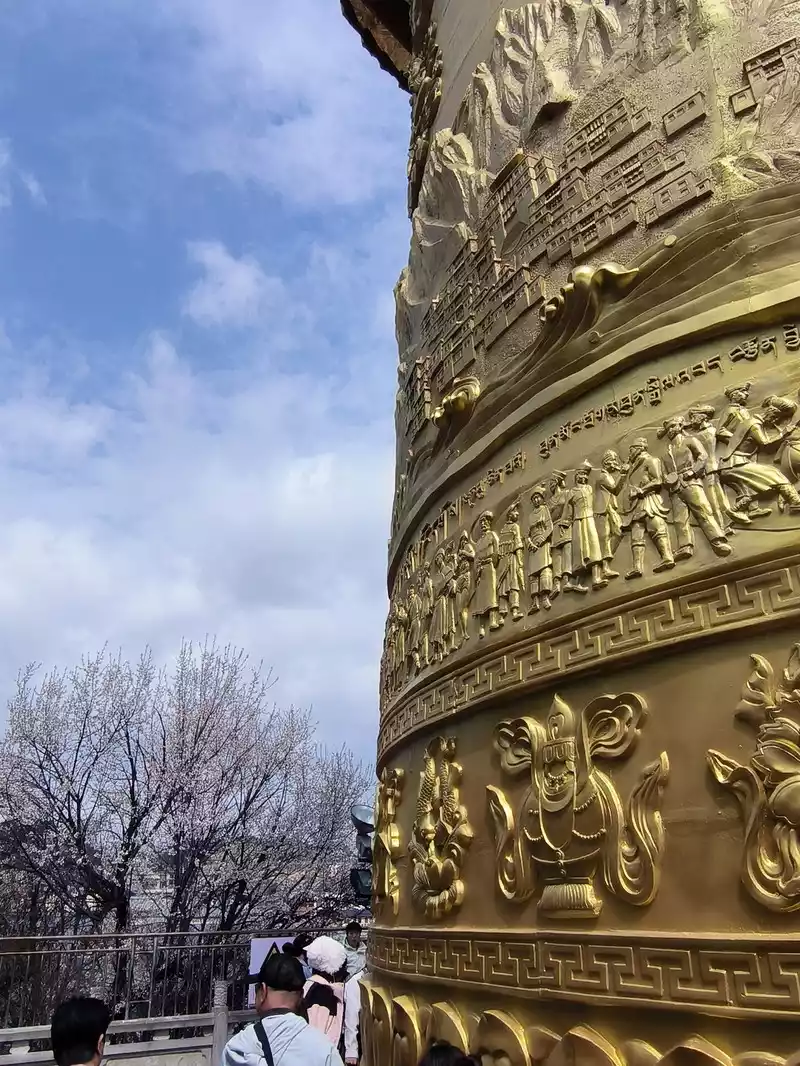 The most eye-catching feature is the world's largest pure copper and gold-plated prayer wheel, standing 21 meters tall and weighing 60 tons. It requires the combined strength of more than a dozen people to rotate, reportedly costing over 90 million yuan and taking three years to complete. The walls are adorned with relief carvings of the four great bodhisattvas—Manjusri, Samantabhadra, Guanyin, and Ksitigarbha—as well as the Eight Treasures of Buddhism. Encased within it are 1.24 million mantras and 16 tons of Buddhist treasures. One rotation is equivalent to chanting 1.24 million Buddha's names. Three consecutive rotations are said to ward off disasters and bring blessings. Standing on Guishan Mountain, one can take in the panoramic views of the ancient city and the urban area. Later, we discovered that the area outside the ancient city's east gate is a tourist hub, home to numerous hotels and guesthouses, and bus stops.