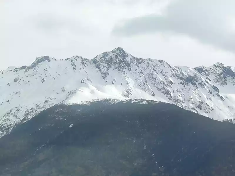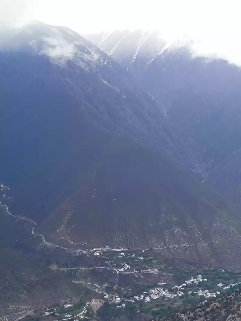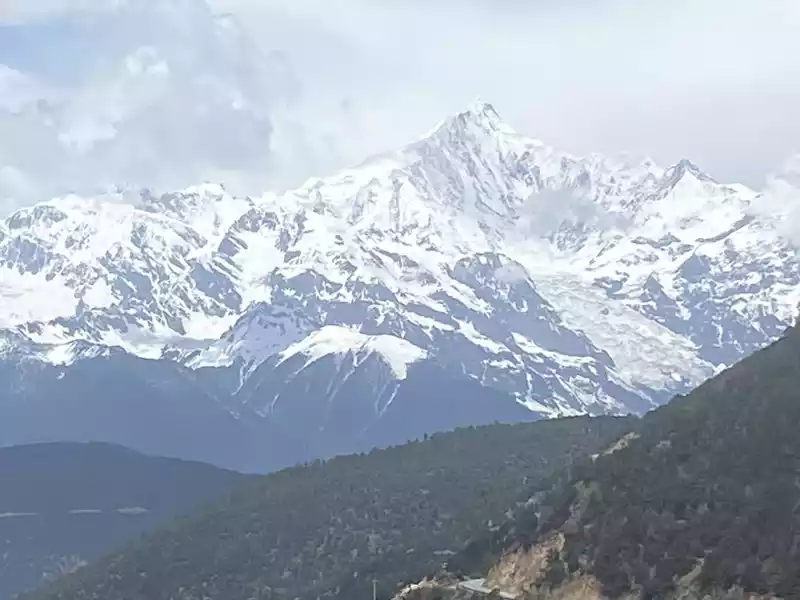 The third is Baima Snow Mountain, with continuous peaks and white snow. Looking from a distance, the main peak covered with snow all year round looks like a galloping white horse, hence the name "Baima Snow Mountain". There are 20 peaks above 5,000 meters above sea level along the route. The main peak, Baima Snow Mountain, is 5,430 meters above sea level, with a relative height difference of more than 3,000 meters. It is now a national nature reserve. Cheli passed by the three-way intersection of Deqin County, where many people got off and went to Yubeng Village.