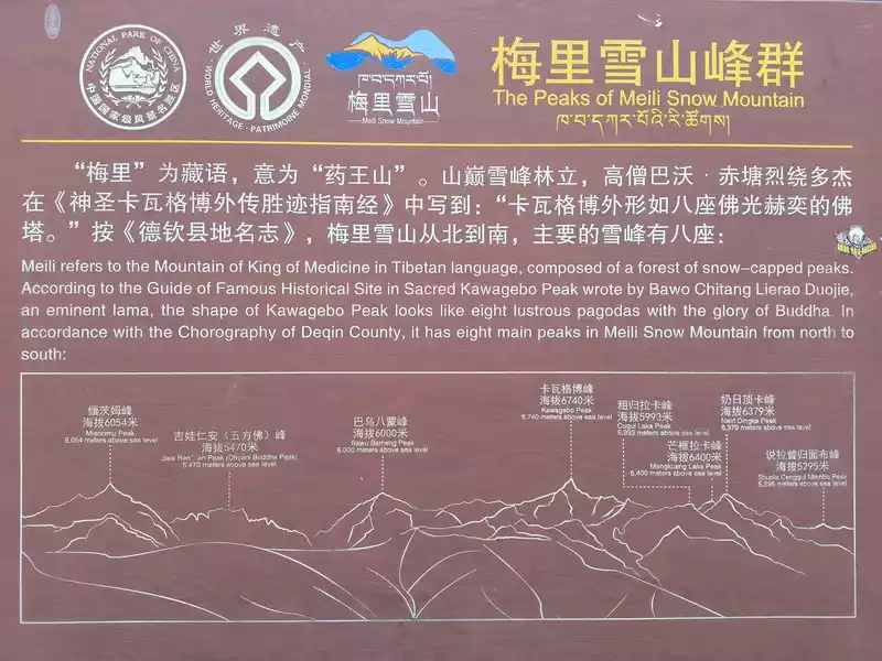 Deqin County is located in the northwest corner of Yunnan Province, at the junction of Yunnan, Tibet and Sichuan provinces. It is located in the "Three Parallel Rivers" area of Jinsha River, Lancang River and Nujiang River. It is the northernmost county in Diqing Prefecture. The Meili Snow Mountain sits on the Yunnan-Tibet border west of Deqin County. Named for the region's abundance of precious medicinal herbs, Meili, a transliteration of the Tibetan word for "Medicine Mountain," is a vast, north-south snow-capped mountain range and Yunnan's most spectacular snow-capped mountain landscape. The Lancang and Nu Rivers flow through the base of the mountains on either side, with the northern section known as the Meili Snow Mountain, the middle section as the Taizi Snow Mountain, and the southern section as the Biluo Snow Mountain. These hundreds of miles of snow-capped peaks cover 34.5% of Deqin County. Thirteen peaks, known as the "Thirteen Peaks of the Prince," rise above 6,000 meters, and the main peak, Kawagebo, rises 6,740 meters. Its towering pyramid-like form is the highest peak in Yunnan. Diqing's terrain is high in the north and low in the south, with its river valleys open to the south. Warm, humid air rising from the valleys meets cold air, making the climate unpredictable. It's said that the Meili Snow Mountain can only be seen a little over 40 days a year, a probability of only one in nine. Meili Snow Mountain is considered one of the four sacred mountains of Tibetan Buddhism, along with Mount Kailash in Tibet, Mount Amnye Machen in Qinghai, and Mount Gaduo Jowo in Qinghai. National Geographic magazine ranked Meili Snow Mountain fourth in its "China Beauty Pageant," a list of the top ten most beautiful mountains. Some online have called it China's most beautiful snow mountain, with Yulong in Lijiang not even half as beautiful. Meili Snow Mountain (Image from the Internet) is ideal for viewing the Meili Snow Mountain during the winter and spring months of October to March, with the best time being in late October when the weather is clear and transparent, and the main peak of Kawagebo is often visible. There are two places to view the Meili Snow Mountain. One is Feilai Temple, 10 kilometers west of the city. This temple was built in the 42nd year of the Wanli reign of the Ming Dynasty (1614 AD), with an altitude of 3,439 meters. The straight-line distance from the main peak of Meili Snow Mountain, Kawagebo, is no more than 6 kilometers. It is the best viewing point closest to the snow mountain and with the widest view. It is famous for its high and far-reaching vision. The platform is wide and has a large capacity. It faces the snow mountain with an unobstructed view. The main peak Kawagebo, Mingyong Glacier and the village at the bottom of the Lancang River Grand Canyon are all in sight; the other is Nongwuding Village, 11 kilometers south of the city, with an altitude of 3,600 meters, slightly higher than Feilai Temple. The vision here is flat and far-reaching, the snow mountain is more majestic, and the peak outline is more obvious. Most tourists come here to see the mountain in winter, but it is 18 kilometers away from the snow mountain, and as its name suggests, the fog here is more frequent and thicker. Feilai Temple and Nongwuding are not far apart in a straight line, but the drive is more than 20 kilometers. Both places have their own advantages and scenic spots, but I found that Shangri-La has a special bus that goes directly to Feilai Temple. For the convenience of transportation, I finally chose the former.