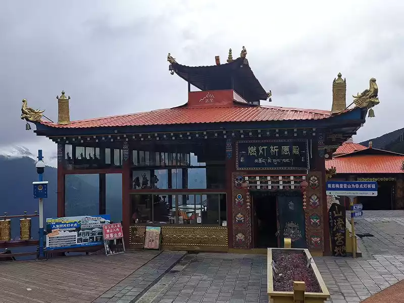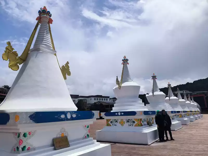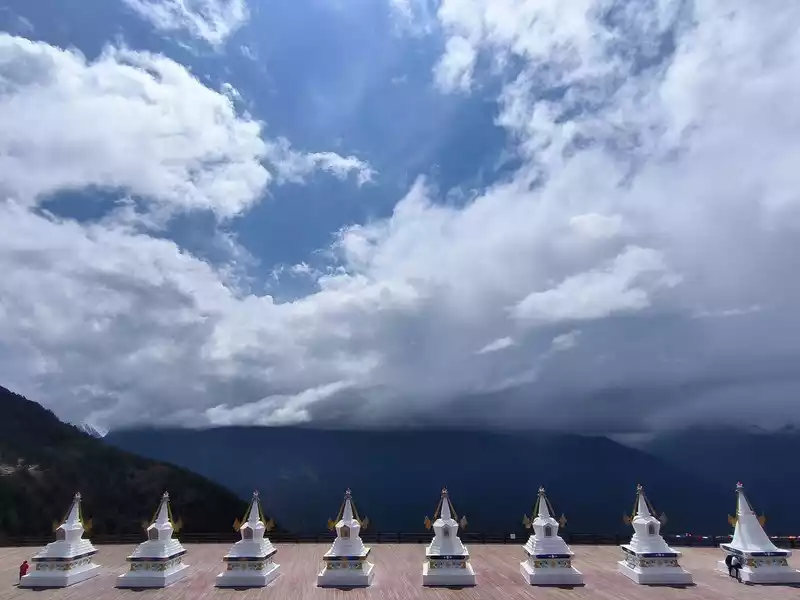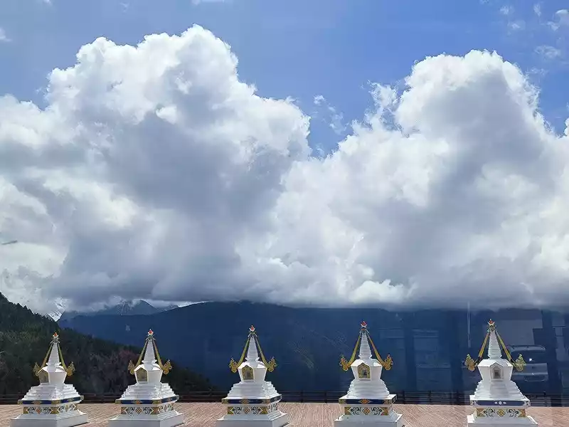 We arrived at Feilai Temple at 1 pm. This is a free attraction. We can see the 8 peaks of Meili Snow Mountain from south to north, 5 of which are above 6000 meters above sea level and the other 3 are between 5000 and 6000 meters. Therefore, there are 8 white pagodas on the large viewing platform. Below is the Lancang River Grand Canyon. Villages at the bottom of the valley are vaguely visible. However, Feilai Temple looks relatively ordinary. It seems to be just a tin house, and tourists are not allowed to enter.