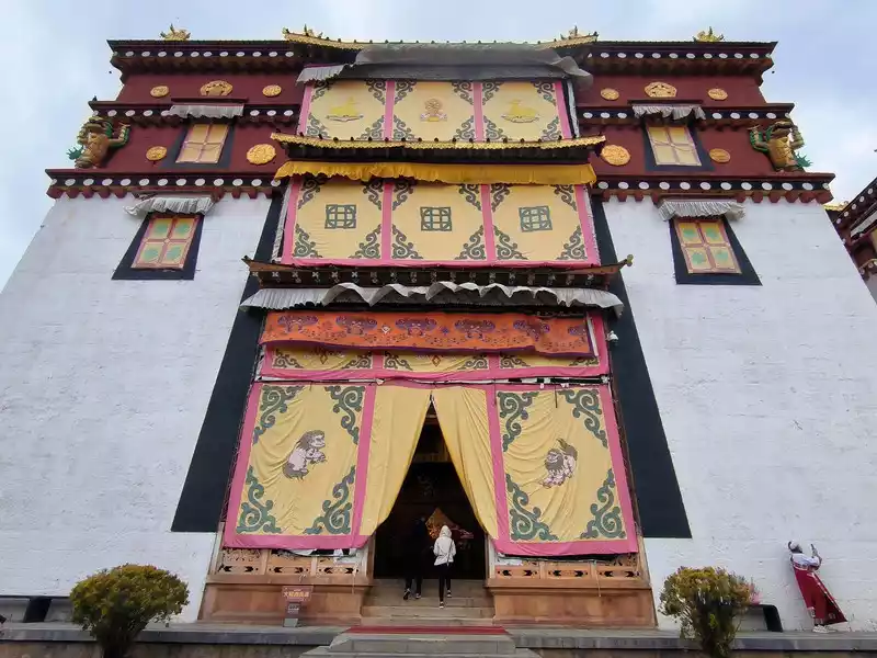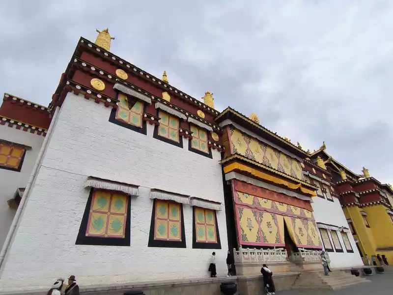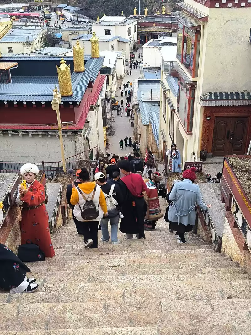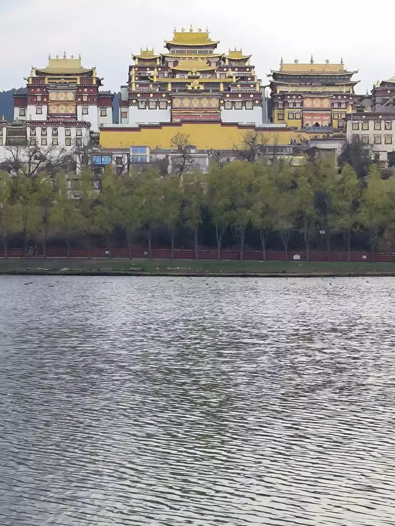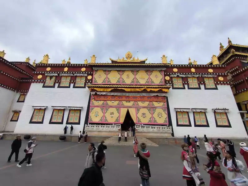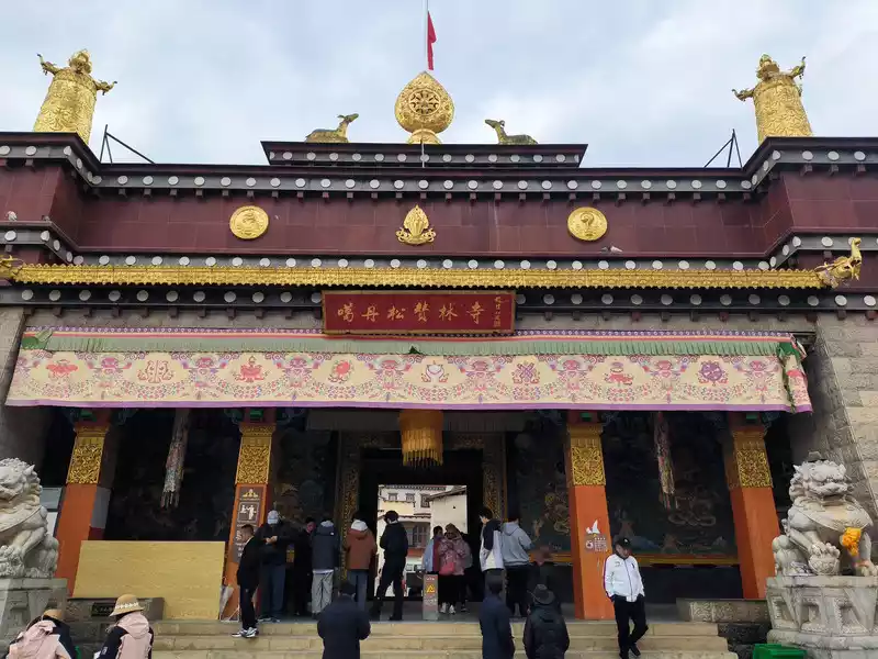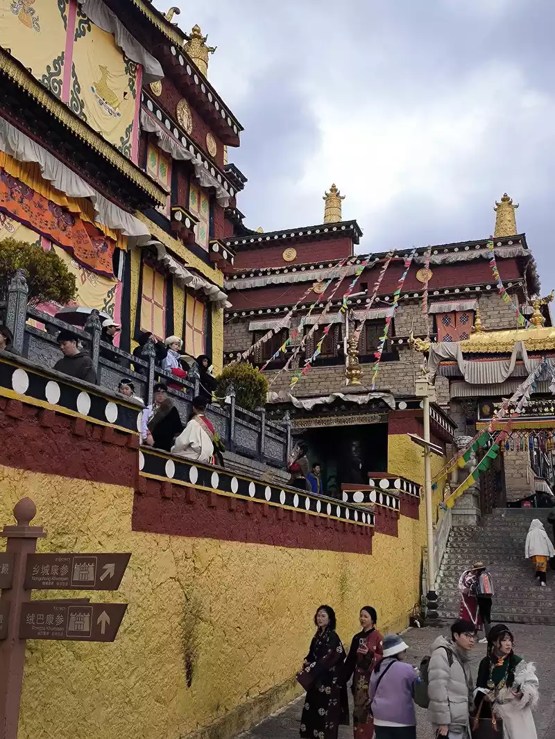We then took bus No. 1 into the city to stay overnight. In the afternoon, we headed to Songzanlin Monastery in the north of the city, a spot we hadn't visited when we first arrived 20 years ago. Looking at pictures online, it looks majestic and mysterious, reflected by the lake. Nestled against the mountain and facing the lake, Songzanlin Monastery is a magnificent sight. It is the highest institution of the region's theocratic system, known as the "Little Potala Palace." It is the largest Tibetan Buddhist monastery in Yunnan and a sacred site for the "Three Treasures" of Buddhism, Dharma, and Sangha in the Yunnan, Tibet, and Sichuan regions. Pilgrims flock to the monastery year-round, and the incense is incredibly popular. Songzanlin Monastery was built in 1679, the 18th year of the reign of Emperor Kangxi of the Qing Dynasty. Legend has it that the temple's site was chosen by the Fifth Dalai Lama through divination, and the temple's name was also bestowed by him. "Songzan" refers to the roaming abode of the three celestial gods, Indra, Mahasthamaprapta, and Lousu, and "Lin" means "temple." The Qing Dynasty bestowed the name "Guihua Temple." The buildings, predominantly white, follow the slope of the mountain, forming a complex of Tibetan and Han temple styles. An oval wall surrounds the temple, and within it are over 300 buildings. From left to right on the mountaintop are the Tsongkhapa Hall, the Dratsang Hall, and the Sakyamuni Hall, representing the Three Jewels of Sangha, Dharma, and Buddha. The three main halls on the mountaintop are majestic and magnificent. The murals within are vibrant and delicately painted, depicting historical events and promoting Buddhist teachings. Tsongkhapa's name is "Jikang" in Tibetan, so the Tsongkhapa Hall is also known as the Jikang Hall. The three main temples—Zhacang, Jikang, and Sakyamuni Hall—are located at the highest point, at the center of the temple complex. Surrounding them are the eight Kangcan buildings, monks' quarters, and other structures. Their staggered heights and progressive layers create distinct three-dimensional contours, fully highlighting the grandeur of the main building. "Zacang" means monastery in Tibetan. It is a place where monks study scriptures and research doctrines. It is also the core building of Songzanlin Monastery. In front of the main hall stands a bronze statue of the Fifth Dalai Lama, followed by the stupas of the remains of famous monks. The top floor of the main building is a special scripture house and Buddhist hall, which houses the statues of the Fifth Dalai Lama and the Seventh Dalai Lama, as well as palm leaf scriptures, thangkas, and handed down Buddhist instruments. To the south of the Buddhist hall is a towering bell and drum tower, which beats drums to tell time in the early morning, noon and dusk, and the sound can be heard for ten miles.The subordinate monastic organization of Dratsang is the "Khamtsan," which means "monastic community" in Tibetan. This organization divides the monks of a large monastery into several groups based on their place of origin or origin, forming regional organizations within the diocese. The Khamtsan is presided over by a senior monk and is staffed by staff such as Nianwa and Gegan, who independently manage the administrative, religious, and economic affairs of the diocese. The eight major Khamtsans of Songzanlin Monastery are: Duk, Zhaya, Dongwang, Rongba, Yangduo, Jiedi, Zhuo, and Xiangcheng. Songzanlin Monastery embodies the essence of Tibetan religious culture. Its magnificent architecture features colorful gilded copper tiles and eaves adorned with animal-shaped horns. It represents the epitome of Tibetan plastic arts and is known as the "Tibetan Art Museum." The monastery houses numerous historical treasures, including eight gilded Buddha statues from the reigns of the Fifth and Seventh Dalai Lamas, palm-leaf sutras, thangkas painted in multicolored gold, and golden lamps. In the summer of 1936, when He Long led the Second Red Army through Shangri-La during the Long March, He Long, Xiao Ke, and others visited the monastery, met with the Living Buddha and lamas, and presented it with a brocade scroll inscribed with the words "Prosperity of the Tribes." The monastery also raised over 20,000 kilograms of grain for the Red Army and sent monks as guides to support the army's march northward against the Japanese.