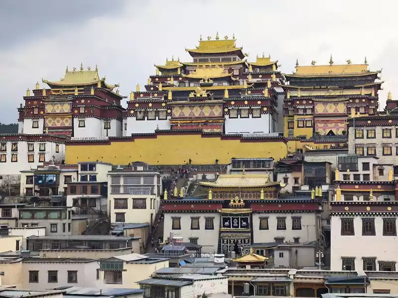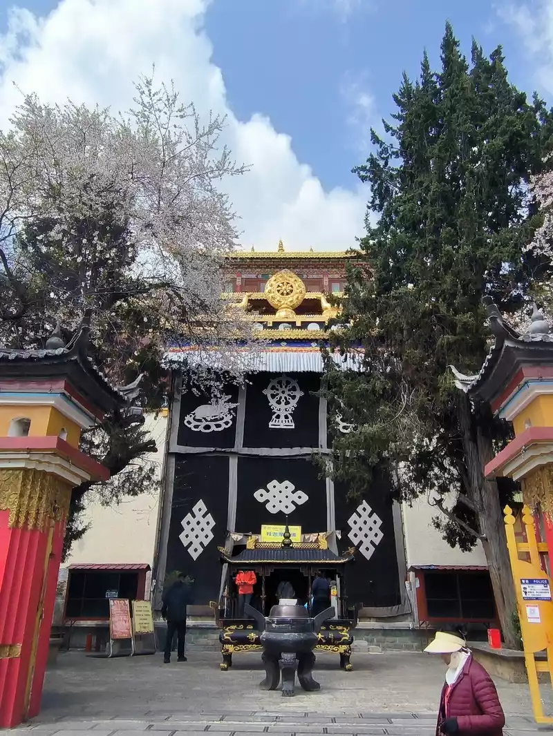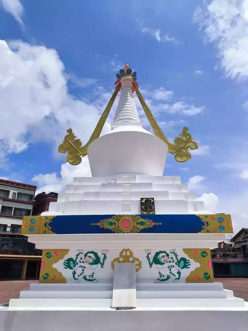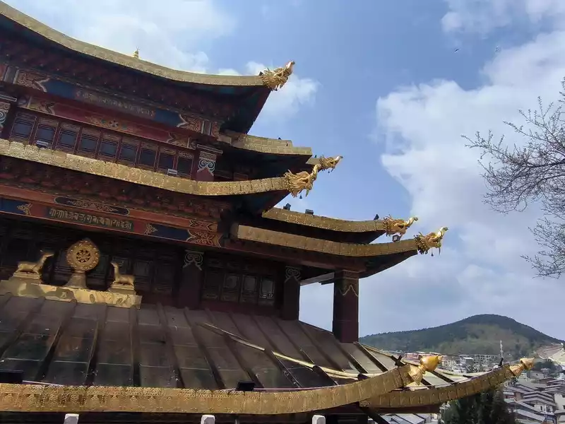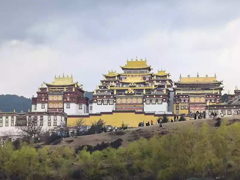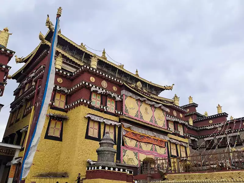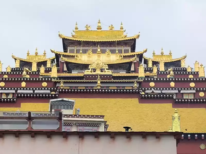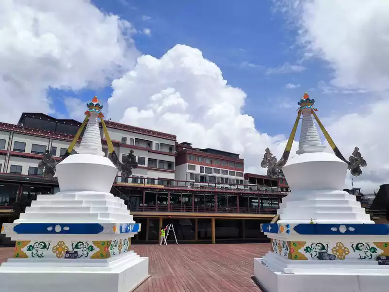 We then took bus No. 1 into the city to stay overnight. In the afternoon, we headed to Songzanlin Monastery in the north of the city, a spot we hadn't visited when we first arrived 20 years ago. Looking at pictures online, it looks majestic and mysterious, reflected by the lake. Nestled against the mountain and facing the lake, Songzanlin Monastery is a magnificent sight. It is the highest institution of the region's theocratic system, known as the "Little Potala Palace." It is the largest Tibetan Buddhist monastery in Yunnan and a sacred site for the "Three Treasures" of Buddhism, Dharma, and Sangha in the Yunnan, Tibet, and Sichuan regions. Pilgrims flock to the monastery year-round, and the incense is incredibly popular. Songzanlin Monastery was built in 1679, the 18th year of the reign of Emperor Kangxi of the Qing Dynasty. Legend has it that the temple's site was chosen by the Fifth Dalai Lama through divination, and the temple's name was also bestowed by him. "Songzan" refers to the roaming abode of the three celestial gods, Indra, Mahasthamaprapta, and Lousu, and "Lin" means "temple." The Qing Dynasty bestowed the name "Guihua Temple." The buildings, predominantly white, follow the slope of the mountain, forming a complex of Tibetan and Han temple styles. An oval wall surrounds the temple, and within it are over 300 buildings. From left to right on the mountaintop are the Tsongkhapa Hall, the Dratsang Hall, and the Sakyamuni Hall, representing the Three Jewels of Sangha, Dharma, and Buddha. The three main halls on the mountaintop are majestic and magnificent. The murals within are vibrant and delicately painted, depicting historical events and promoting Buddhist teachings. Tsongkhapa's name is "Jikang" in Tibetan, so the Tsongkhapa Hall is also known as the Jikang Hall. The three main temples—Zhacang, Jikang, and Sakyamuni Hall—are located at the highest point, at the center of the temple complex. Surrounding them are the eight Kangcan buildings, monks' quarters, and other structures. Their staggered heights and progressive layers create distinct three-dimensional contours, fully highlighting the grandeur of the main building. "Zacang" means monastery in Tibetan. It is a place where monks study scriptures and research doctrines. It is also the core building of Songzanlin Monastery. In front of the main hall stands a bronze statue of the Fifth Dalai Lama, followed by the stupas of the remains of famous monks. The top floor of the main building is a special scripture house and Buddhist hall, which houses the statues of the Fifth Dalai Lama and the Seventh Dalai Lama, as well as palm leaf scriptures, thangkas, and handed down Buddhist instruments. To the south of the Buddhist hall is a towering bell and drum tower, which beats drums to tell time in the early morning, noon and dusk, and the sound can be heard for ten miles.The subordinate monastic organization of Dratsang is the "Khamtsan," which means "monastic community" in Tibetan. This organization divides the monks of a large monastery into several groups based on their place of origin or origin, forming regional organizations within the diocese. The Khamtsan is presided over by a senior monk and is staffed by staff such as Nianwa and Gegan, who independently manage the administrative, religious, and economic affairs of the diocese. The eight major Khamtsans of Songzanlin Monastery are: Duk, Zhaya, Dongwang, Rongba, Yangduo, Jiedi, Zhuo, and Xiangcheng. Songzanlin Monastery embodies the essence of Tibetan religious culture. Its magnificent architecture features colorful gilded copper tiles and eaves adorned with animal-shaped horns. It represents the epitome of Tibetan plastic arts and is known as the "Tibetan Art Museum." The monastery houses numerous historical treasures, including eight gilded Buddha statues from the reigns of the Fifth and Seventh Dalai Lamas, palm-leaf sutras, thangkas painted in multicolored gold, and golden lamps. In the summer of 1936, when He Long led the Second Red Army through Shangri-La during the Long March, He Long, Xiao Ke, and others visited the monastery, met with the Living Buddha and lamas, and presented it with a brocade scroll inscribed with the words "Prosperity of the Tribes." The monastery also raised over 20,000 kilograms of grain for the Red Army and sent monks as guides to support the army's march northward against the Japanese.