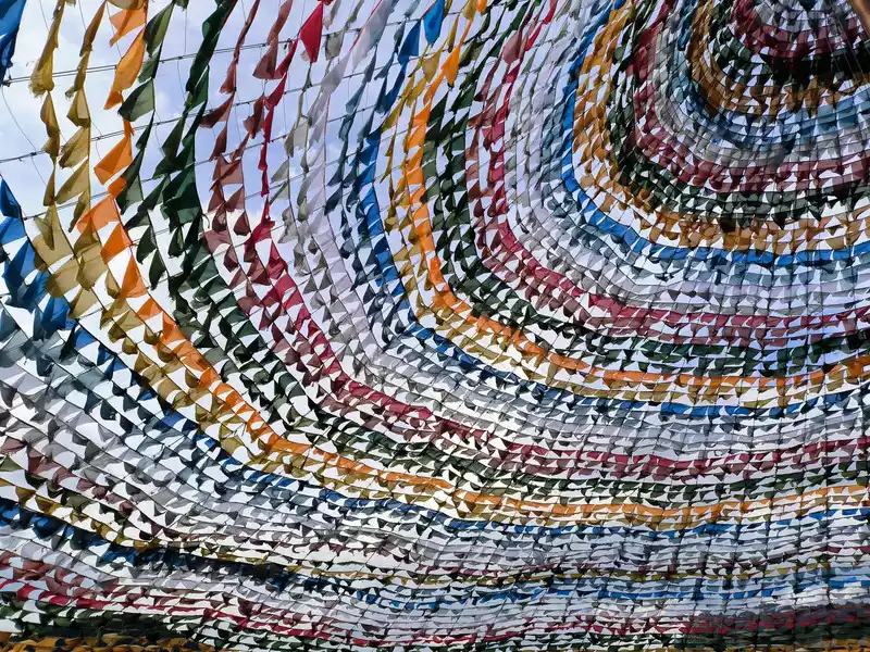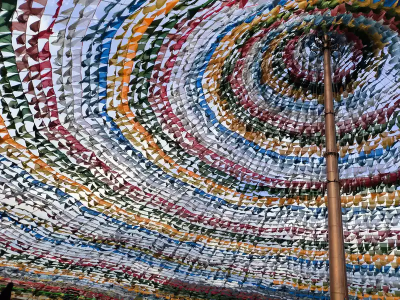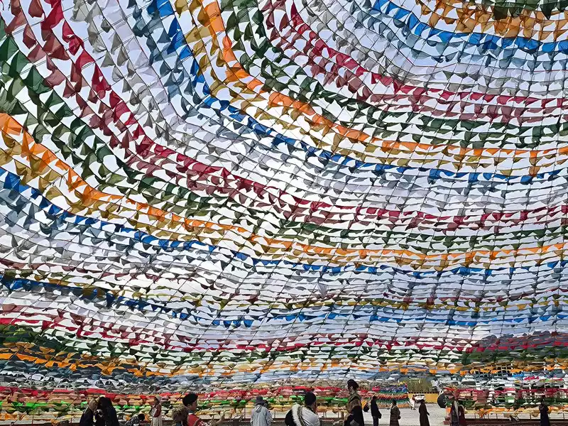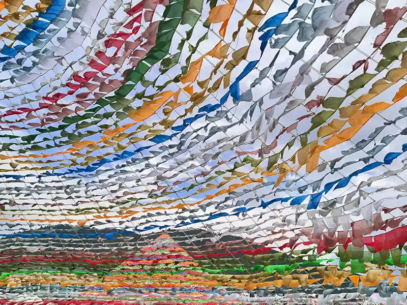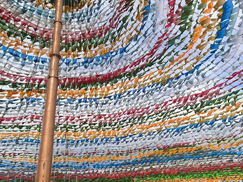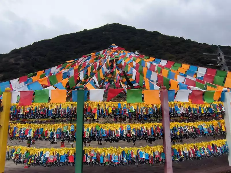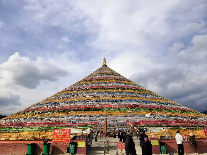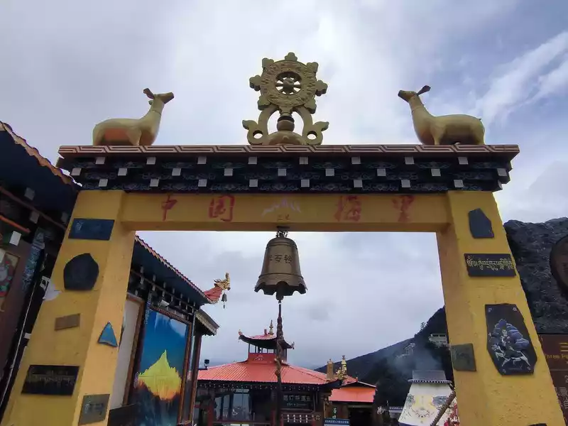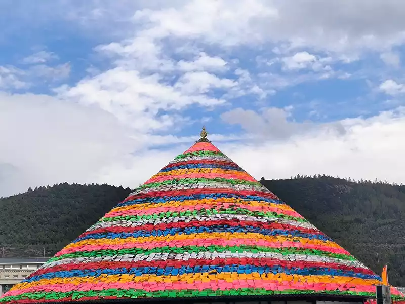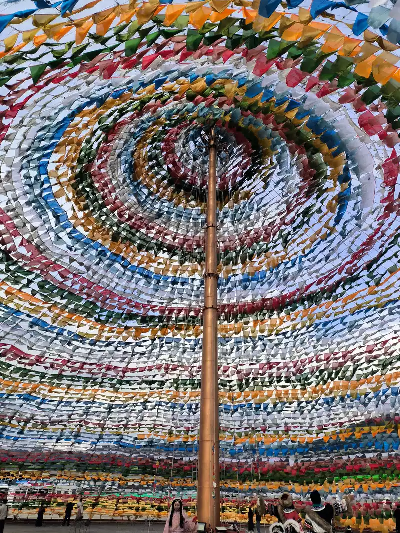 It was still early when we got back to Shangri-La, so we went to the Harmony Tower at the southern end of Shambhala Avenue. Here, you can see the world's largest prayer flag, with a diameter of over 100 meters. Many people come here to check in and take photos, making it another popular check-in spot in Shangri-La. Prayer flags, also known as wind horse flags, are a common and unique landscape in Tibet. They are mostly made of square, angular, or striped cloth. Some are made of linen, silk, and earthen paper. They are usually 10-60 cm long and come in five colors: white, yellow, red, green, and blue.