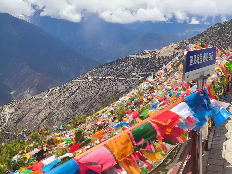 Shangri-La is 180 kilometers away from Feilai Temple. There are many special buses going there every day, which take National Highway 214. The drive takes nearly 4 hours, but there are 3 scenic spots to see along the way: one is He Long Bridge. In May 1936, He Long and Ren Bishi led the Second Corps of the Red Army from Yunnan to Sichuan. They encountered armed resistance from local reactionary forces here. After the victory of the battle, He Long climbed to the Zhanaya Pass and said that when the revolution was victorious in the future, he would build a bridge here to connect the two places. In 1958, the local government built an 85-meter-long steel frame bridge with a span of 75 meters, named the Helong Bridge. The bridge is now abandoned and inaccessible to pedestrians and vehicles. However, the rock military flag on the cliff covers an area of 1,936.6 square meters and has been officially certified by the World Records as the "largest flag built on rock." Helong Bridge