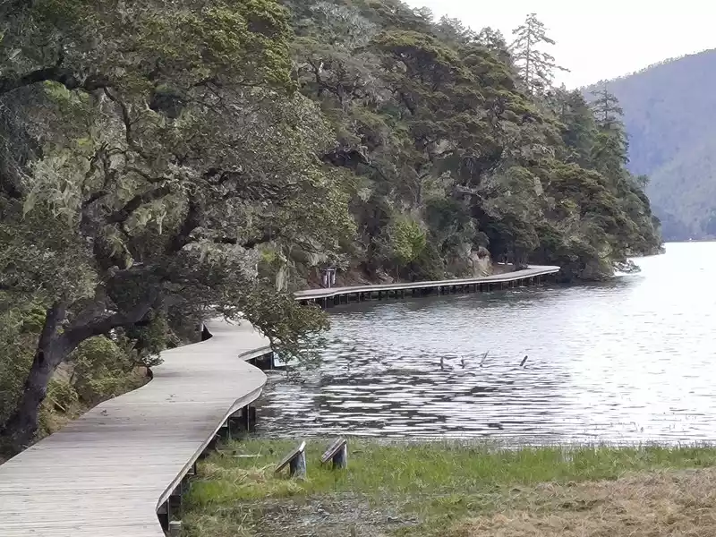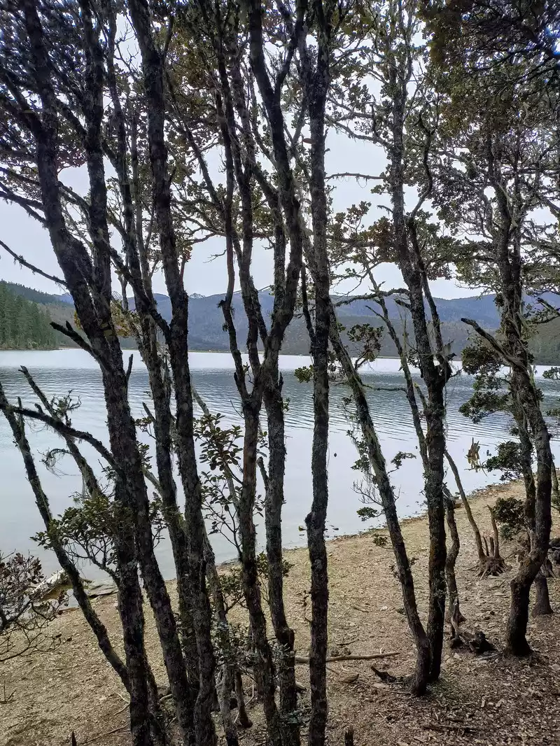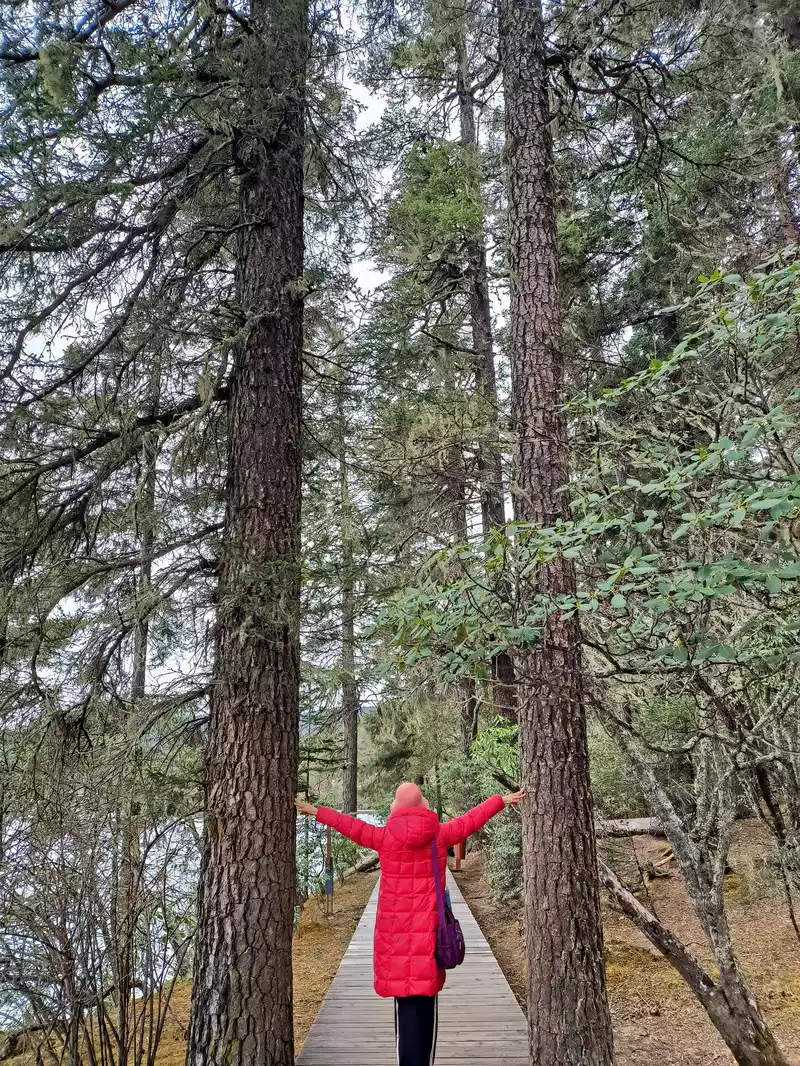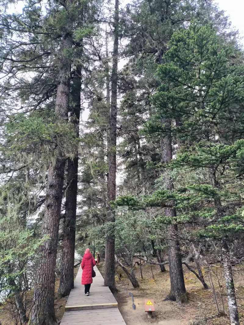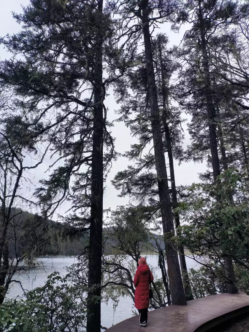 The primeval forest blocks out the sky and the sun. The spruce and fir trees are tall and strong, pointing straight into the sky. The squirrels under the trees by the lake do not shy away from people. The trees are hung with fluttering light green silk objects - usnea, which is a favorite food of Yunnan golden monkeys, so it is called the forest with long beards. There are many dead trees and old roots on the east bank. It is said that the drying of the bank foundation caused by the lake water has caused the tree trunks to die. This is a natural phenomenon. Shudu Lake is known as "the world's hiking holy land". It took us 2 hours to basically circle the lake.