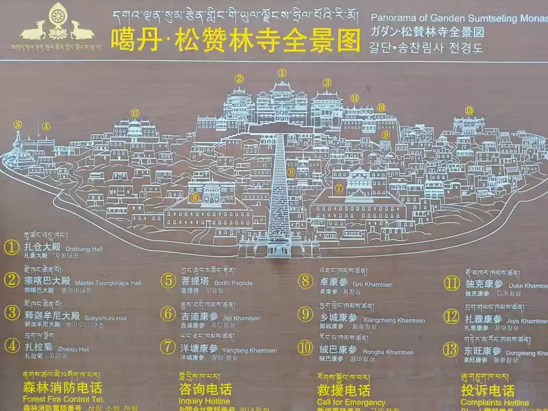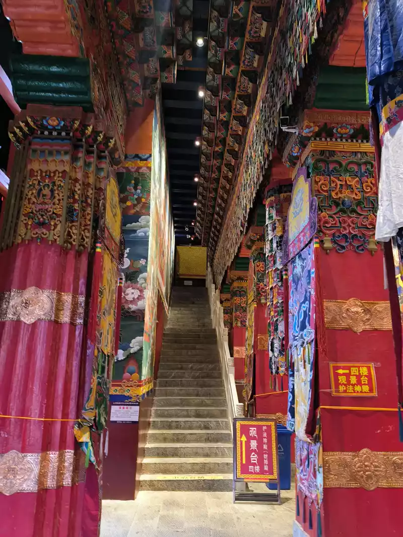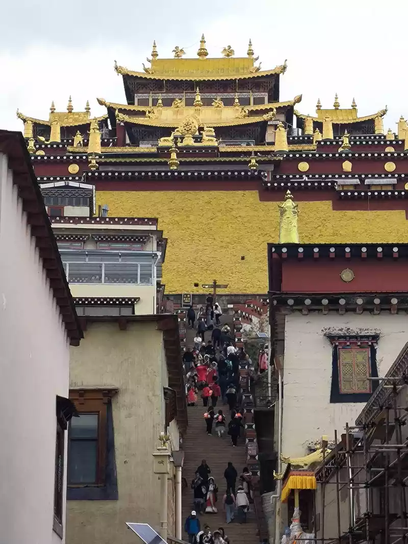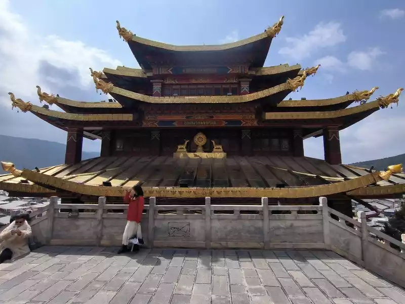 We entered the temple at 3 pm and walked up the steps. There was a large rectangular square on the top of the mountain. The first thing we saw was the Tsongkhapa Hall on the west side, which was slightly lower than the Zhacang Hall. The Zhacang Hall in the middle is the oldest building in Songzanlin Temple. It faces north and south and is a 5-story Tibetan-style carved building.