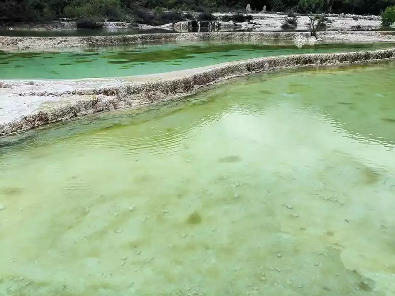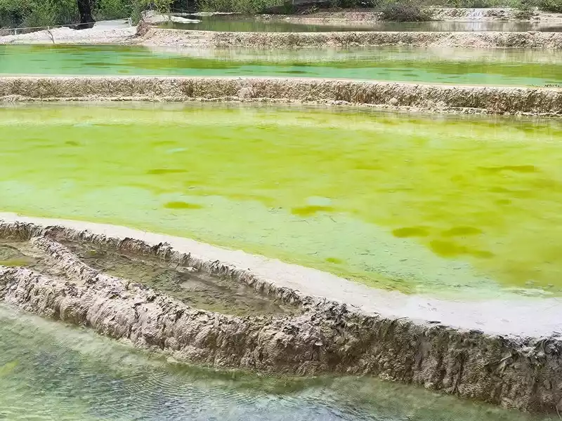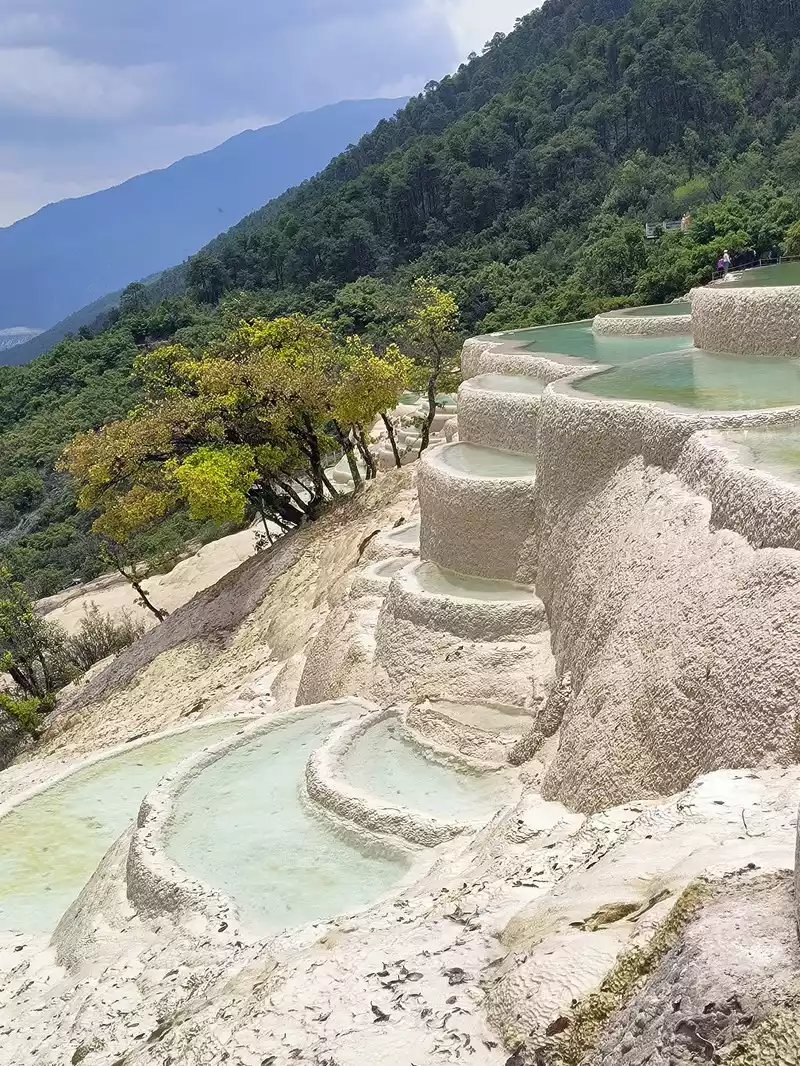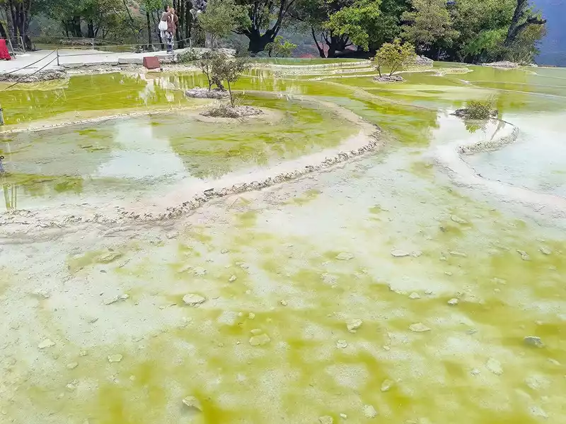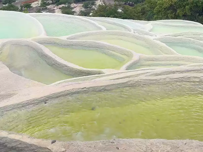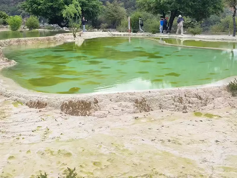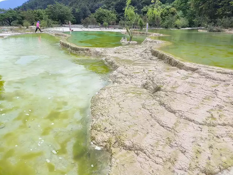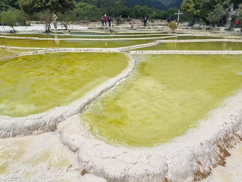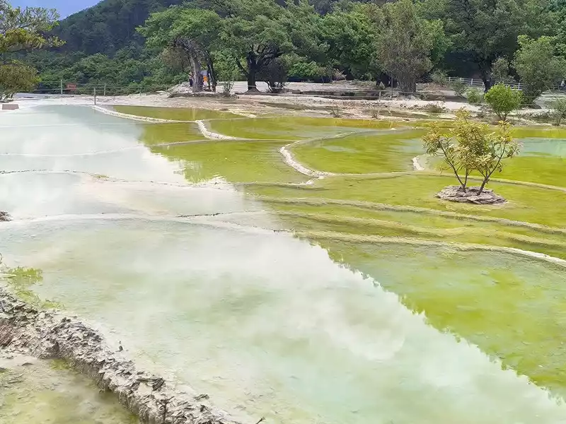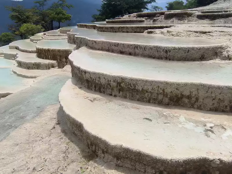 After 20 minutes, you will reach the Five-Colored Fairyland at the top. From above, you can see layers of "terraces", with a height difference of 10-15 cm between each other. From top to bottom, they are stacked layer by layer. It is called the Five-Colored Fairyland, but in fact, the water in this pool is slightly blue and clear to the bottom. This is the most wonderful and essential part of Baishuitai. However, the color of the travertine is yellower than that of Pamukkale in Turkey where we just visited last year. It can barely be called milky white, and the scope of the scenic area is also smaller than that of Pamukkale.