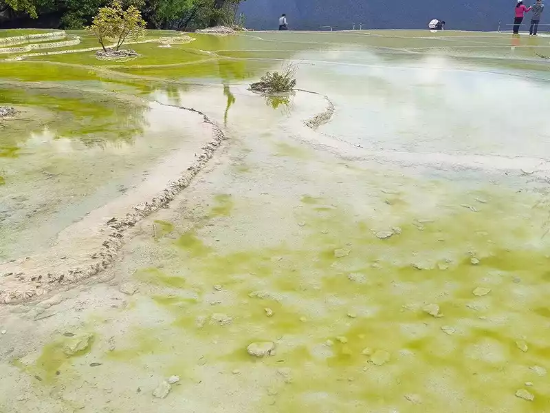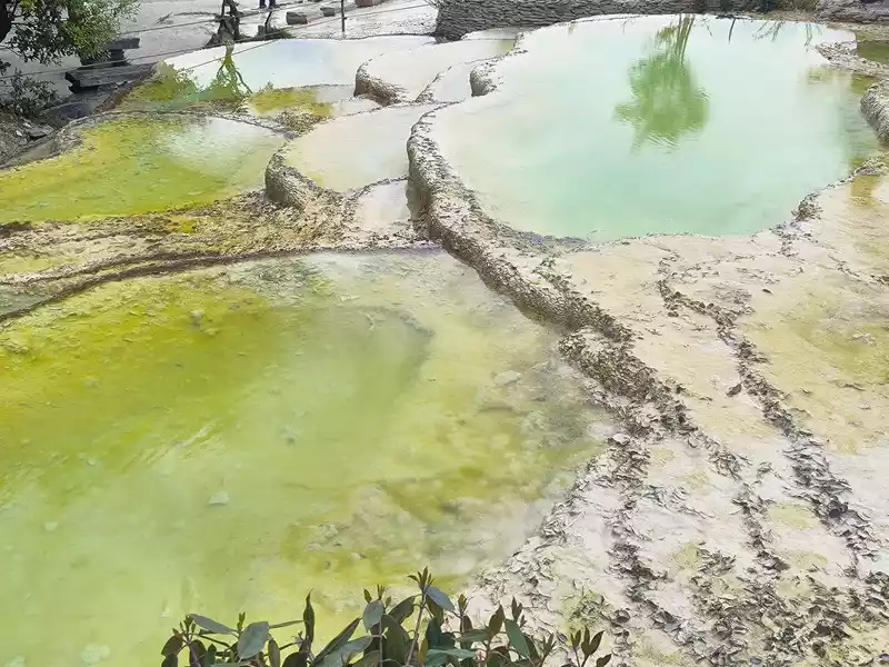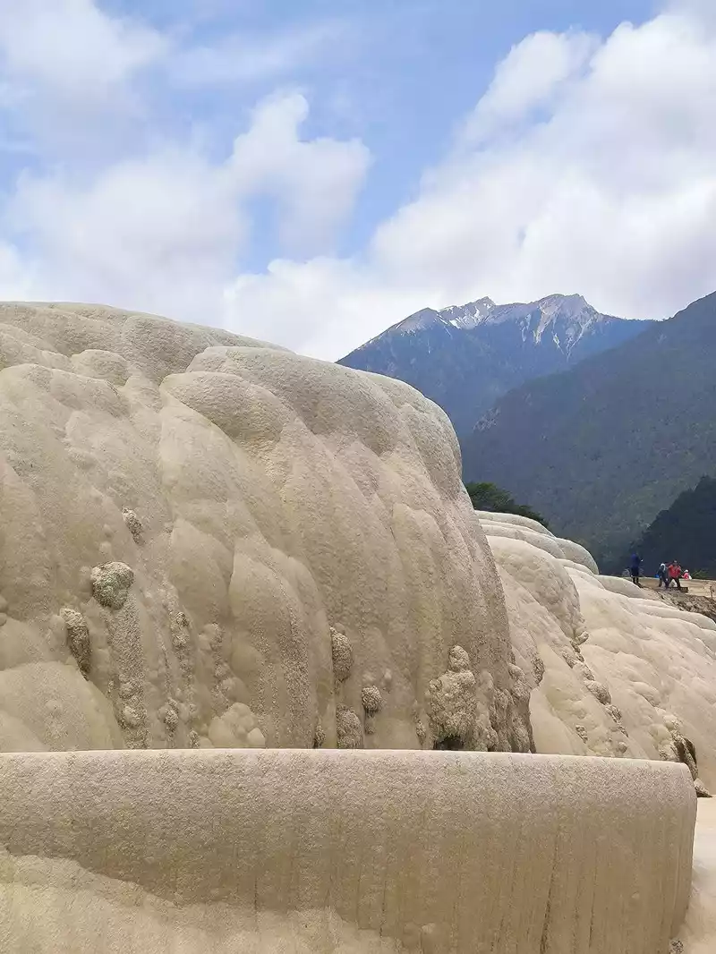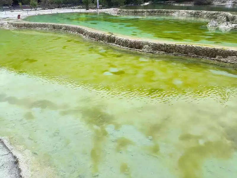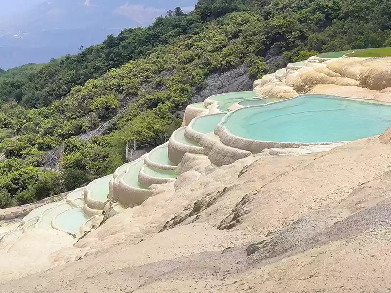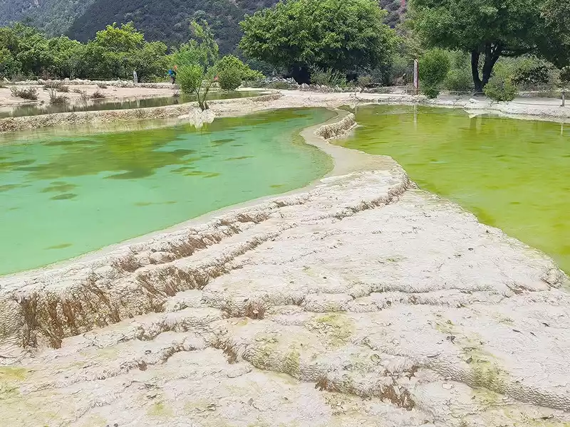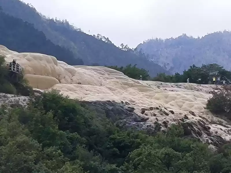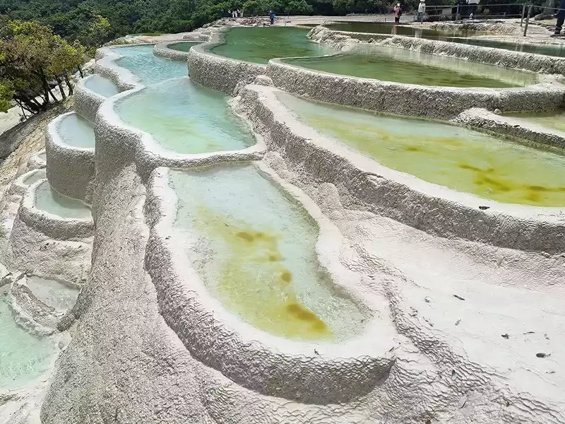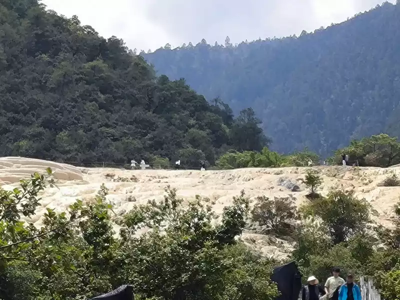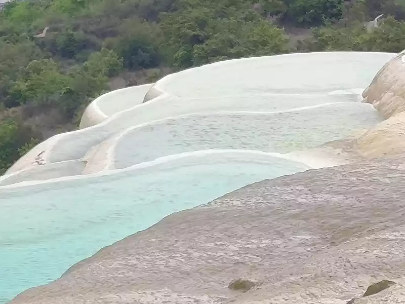 After 20 minutes, you will reach the Five-Colored Fairyland at the top. From above, you can see layers of "terraces", with a height difference of 10-15 cm between each other. From top to bottom, they are stacked layer by layer. It is called the Five-Colored Fairyland, but in fact, the water in this pool is slightly blue and clear to the bottom. This is the most wonderful and essential part of Baishuitai. However, the color of the travertine is yellower than that of Pamukkale in Turkey where we just visited last year. It can barely be called milky white, and the scope of the scenic area is also smaller than that of Pamukkale.