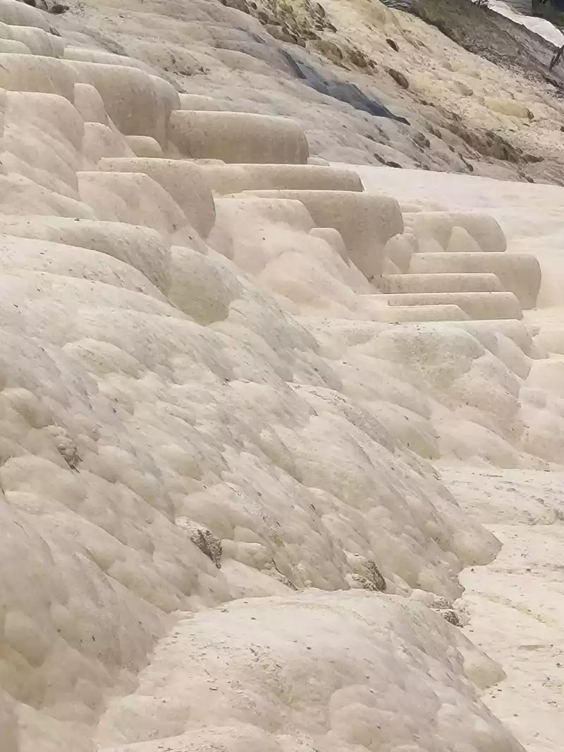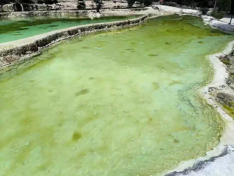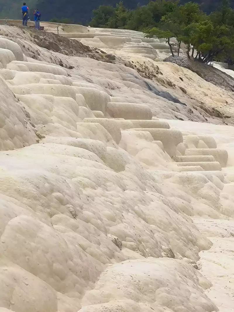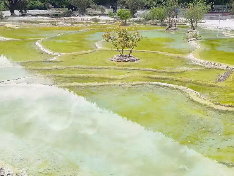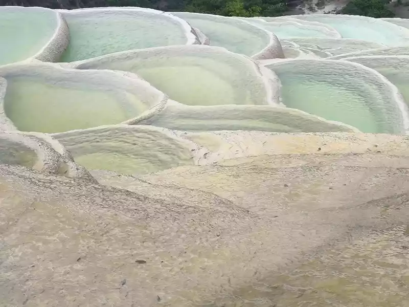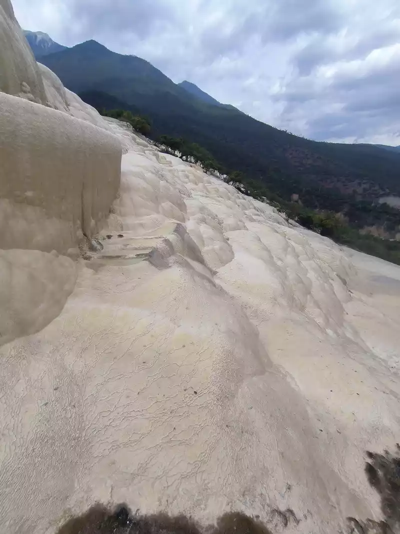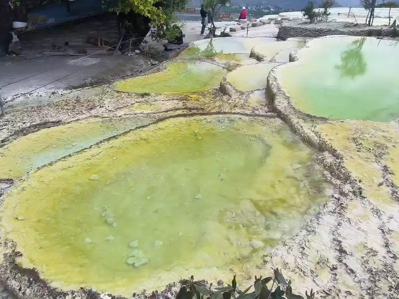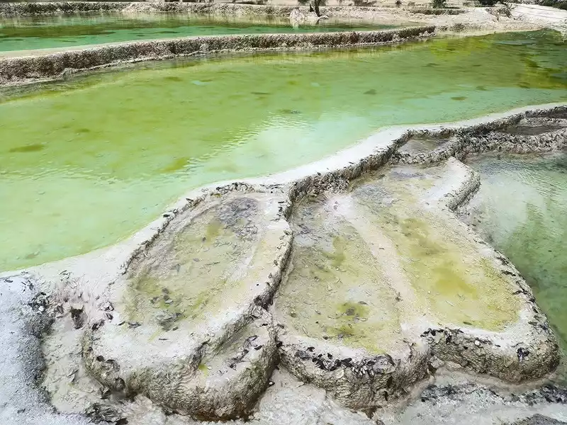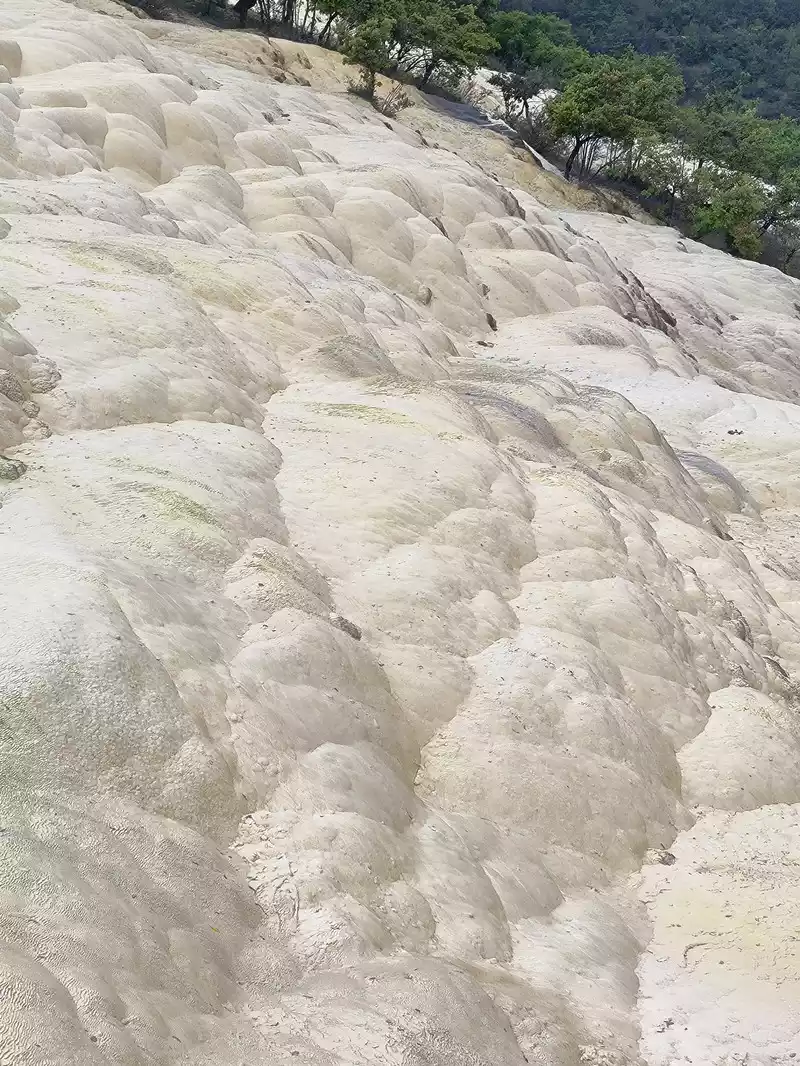 After 20 minutes, you will reach the Five-Colored Fairyland at the top. From above, you can see layers of "terraces", with a height difference of 10-15 cm between each other. From top to bottom, they are stacked layer by layer. It is called the Five-Colored Fairyland, but in fact, the water in this pool is slightly blue and clear to the bottom. This is the most wonderful and essential part of Baishuitai. However, the color of the travertine is yellower than that of Pamukkale in Turkey where we just visited last year. It can barely be called milky white, and the scope of the scenic area is also smaller than that of Pamukkale.